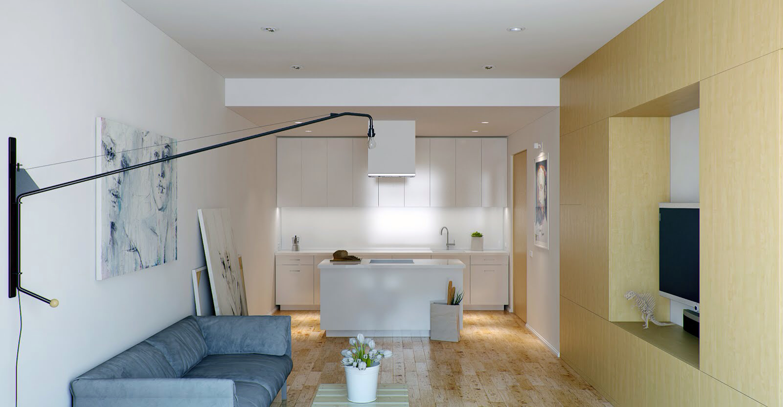 Für einen Raum mit unterschiedlichen Funktionsbereichen eignen sich Punktleuchten, die entlang der Wände positioniert werden können, um den Raum besser ausdehnen zu können. Es ist wichtig zu überlegen, wie weit jede funktionale Zone vom Fenster entfernt ist, denn je näher das Fenster an der Zone liegt, desto heller sollte die Beleuchtung sein. Wenn sich die Zone gegenüber dem Fenster befindet, empfiehlt es sich, Leuchtstofflampen zu bevorzugen,denn sie tragen zu einer Vergrößerung des Raumes und seiner guten Beleuchtung bei.