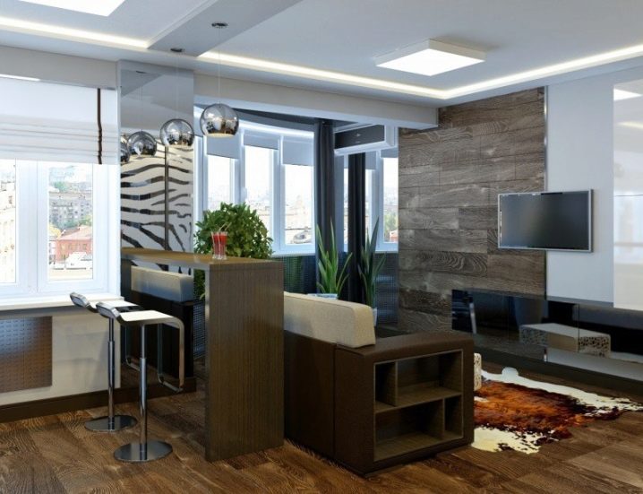 Wenn Sie sich entscheiden, einen Bartresen zu installieren, der Küche und Wohnzimmer trennt, dann sind Racks mit Regalen für verschiedene Behälter wie Flaschen oder Pfannen am besten für ein kleines Studio-Modell geeignet. In solch einer Bar können Sie auch Schränke installieren, die alle notwendigen Dinge für das Wohnzimmer, wie Vasen, TV-Fernbedienungen und andere speichern.
