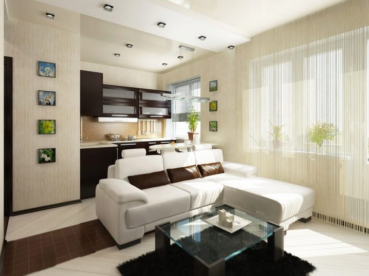 Die am wenigsten beliebte Option ist es, das Studio durch spezielle Vorhänge oder Shirmochek in funktionale Bereiche der Küche und des Wohnzimmers zu unterteilen, da diese Stoffe die Fähigkeit haben, Gerüche aus der Küche aufzunehmen. Bildschirme sind besser geeignet für die Trennung von Schlafzimmern und anderen als der Küche.