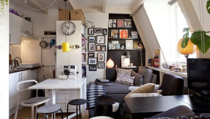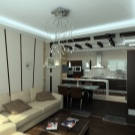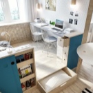 Die Innenausstattung sollte gut durchdacht sein. Möbel, die es nicht wert sind, sperrig und voluminös zu verwenden. Es ist besser, in jeder Zone einen minimalistischen Stil zu verwenden. So wird der Raum größer erscheinen. Es ist besser, Optionen zu wählen, die mehrere Funktionen kombinieren können. Zum Beispiel gibt es Stühle, Betten, Tische, Transformatoren. Sie ermöglichen es Ihnen, Platz zu sparen, Ihren Lebensunterhalt bequem und bequem zu gestalten.