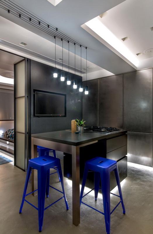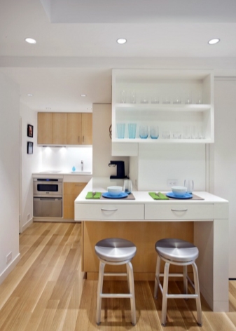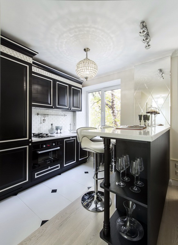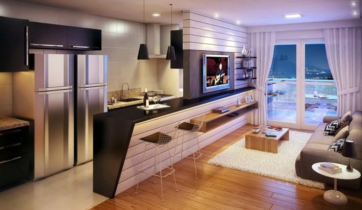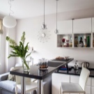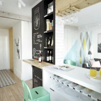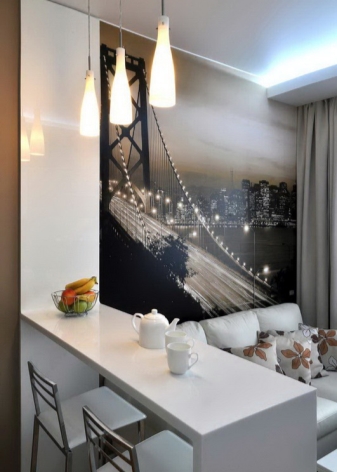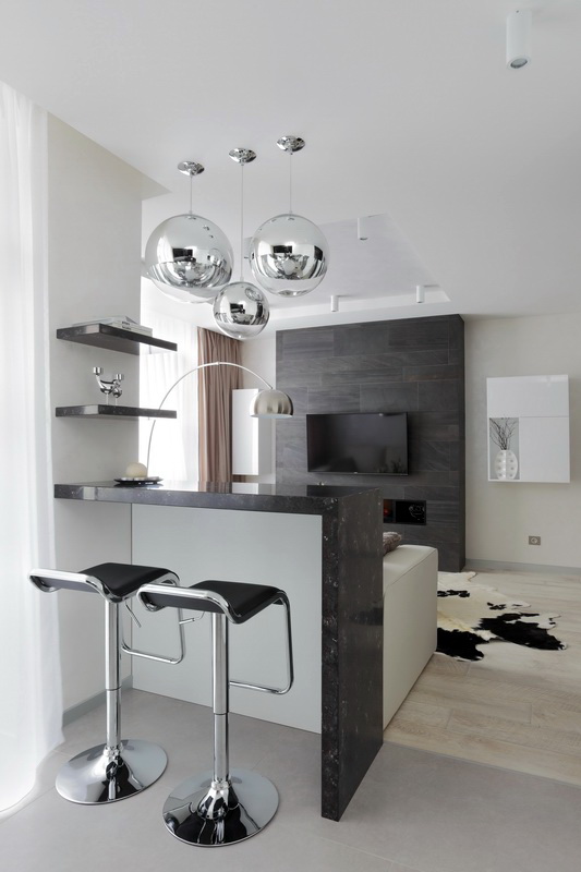 Der Kochbereich kann durch einen Tisch, der einem Bartresen ähnelt, vom Wohnzimmer getrennt werden, ebenso wie ein gemusterter Bodenbelag, eine abgehängte Decke und verschiebbare Glastrennwände. So können Sie eine Küche bestimmen. In einer kleinen Wohnung von 25 Quadratmetern ist auch die Küche klein. Daher sollte es so funktional wie möglich sein.