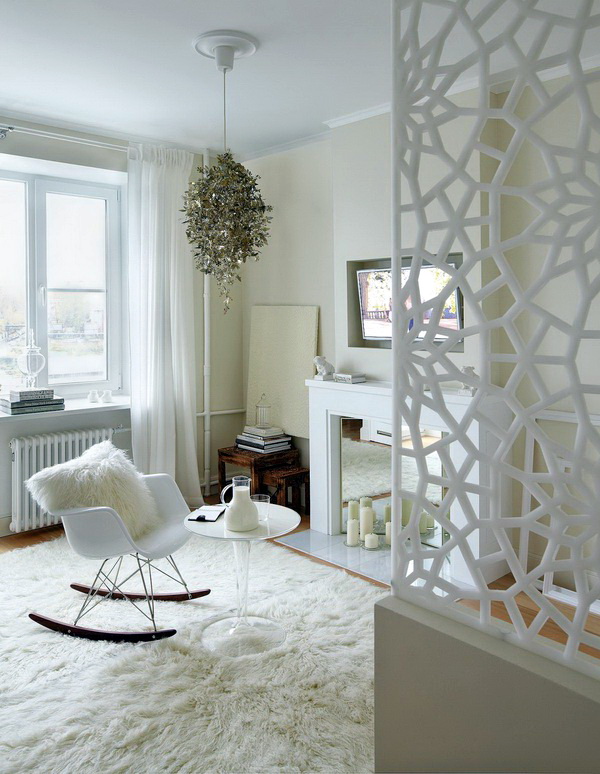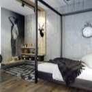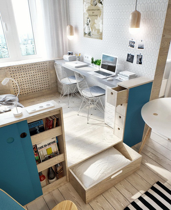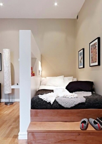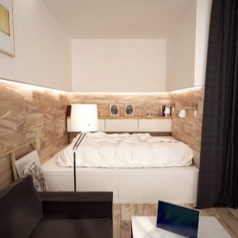 Um Platz zu sparen, ist es möglich, das Schlafzimmer mit einer Trennwand vom Wohnzimmer zu trennen. Die Trennwand kann auch als Regal oder ordentlicher Schrank für Bücher dienen und kann als Kopfteil verwendet werden. Somit können die notwendigen Dinge in dieses Rack gesteckt werden. Schubladen, die geschickt unter dem Bett versteckt sind, erfüllen die gleiche Funktion. In der Halle können Sie auch die Dekorelemente sowie Bücher auf speziellen Hängeregalen platzieren.
