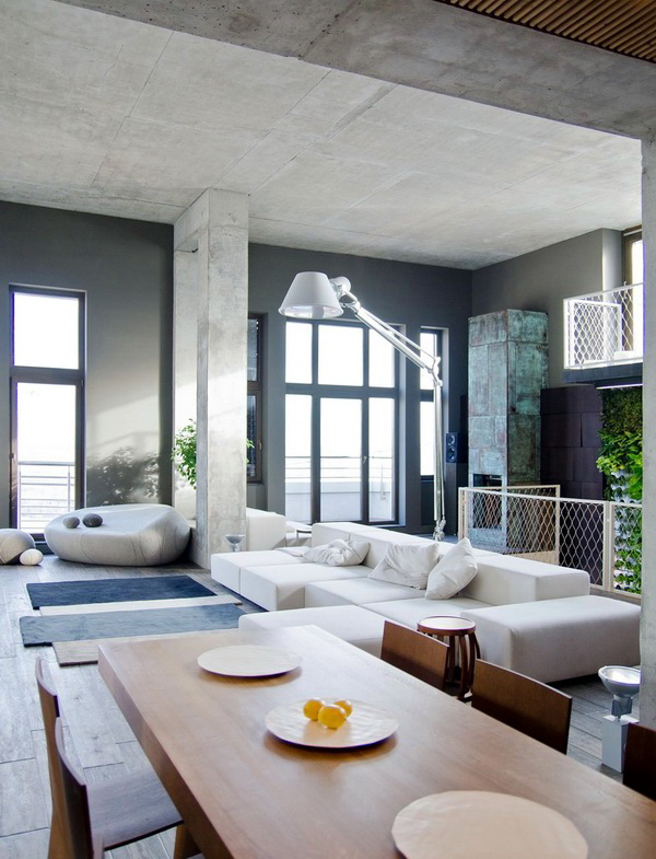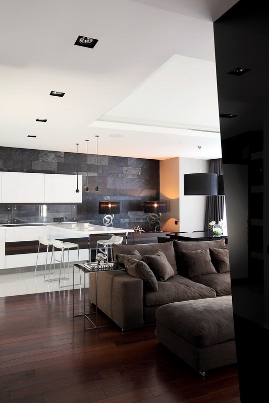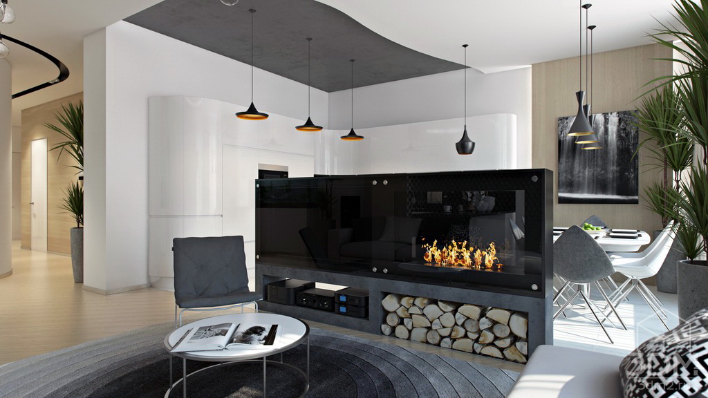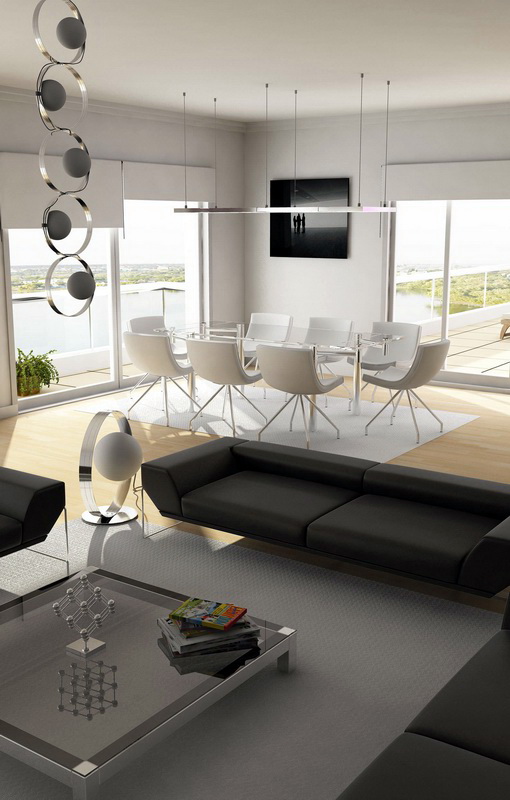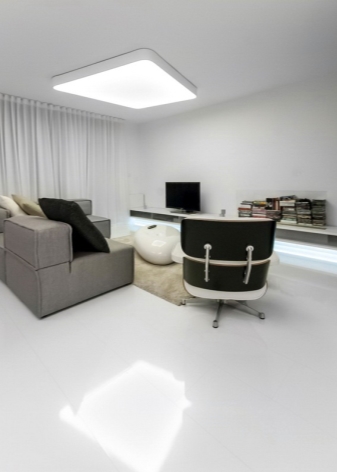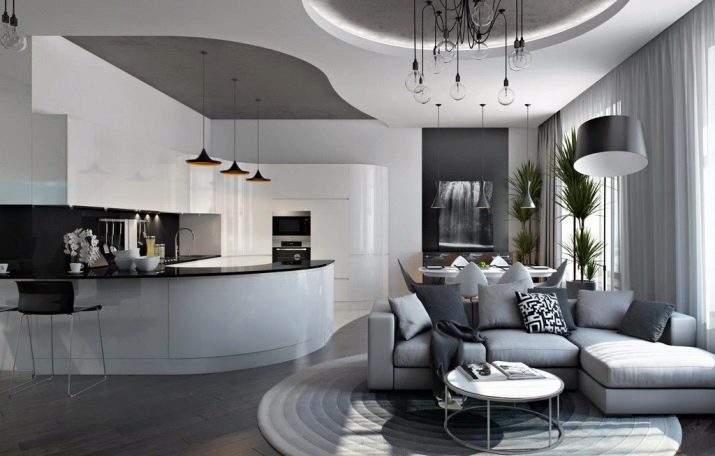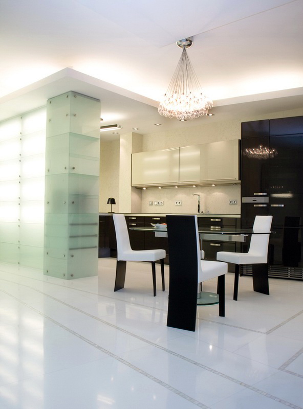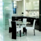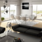 Bezüglich der Farbe ist es in diesem Stil üblich, hauptsächlich Schwarz- und Weiß-Gamma zu verwenden. Besonderer Wert wird auf den Kontrast gelegt. Besser in der Innenarchitektur, um mehr weiße Farbtöne zu verwenden. So vergrößern Sie den Raum optisch. Sie können die Wohnung mit einer Spiegelfläche dekorieren. So vergrößern Sie auch optisch den Raum. Designer empfehlen, Glastische und -stühle zu verwenden.Sie werden dazu beitragen, den Raum noch freier zu machen.
