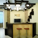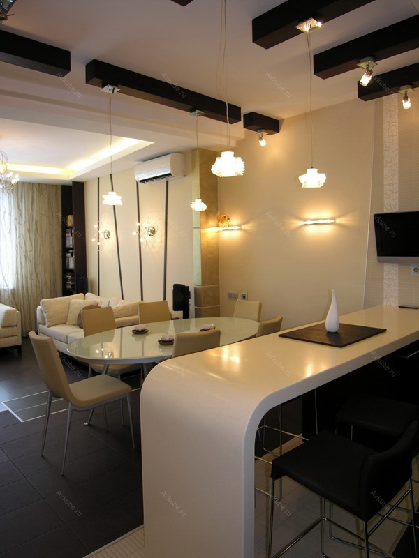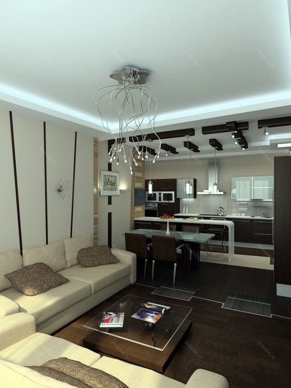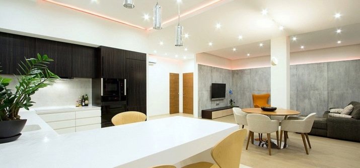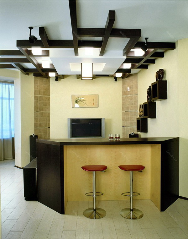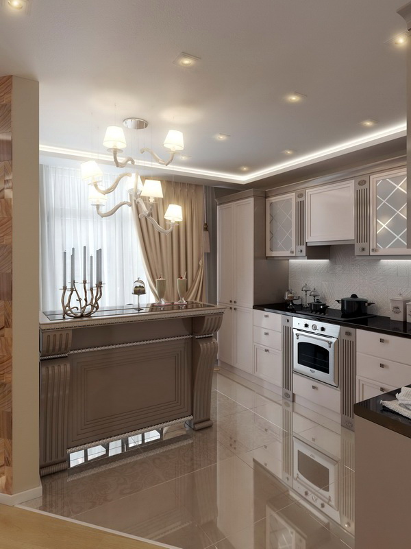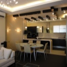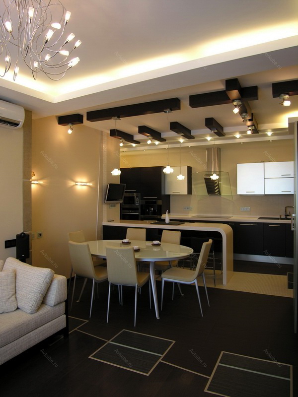 - Die Decke in der Küche kann etwas niedriger sein. Lassen Sie dort versteckte rechteckige Haube, eingebaute Lichter sein.