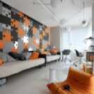 Ein anderes Geheimnis. Um den Raum optisch zu teilen, können Sie verschiedene Tapeten an die Wände der Wohnung kleben. Mit Hilfe einer solchen visuellen Zoneneinteilung kann jede Zone unterschieden werden, sei es ein Kinderzimmer, ein Esszimmer, ein Wohnzimmer oder ein Arbeitsbereich. Auch beim Zoning können Sie zusätzlich verschiedene Deckenleuchten anbringen, unterschiedliche Decken- und Bodengeometrien erstellen.