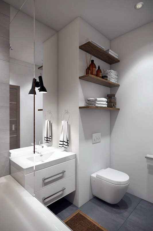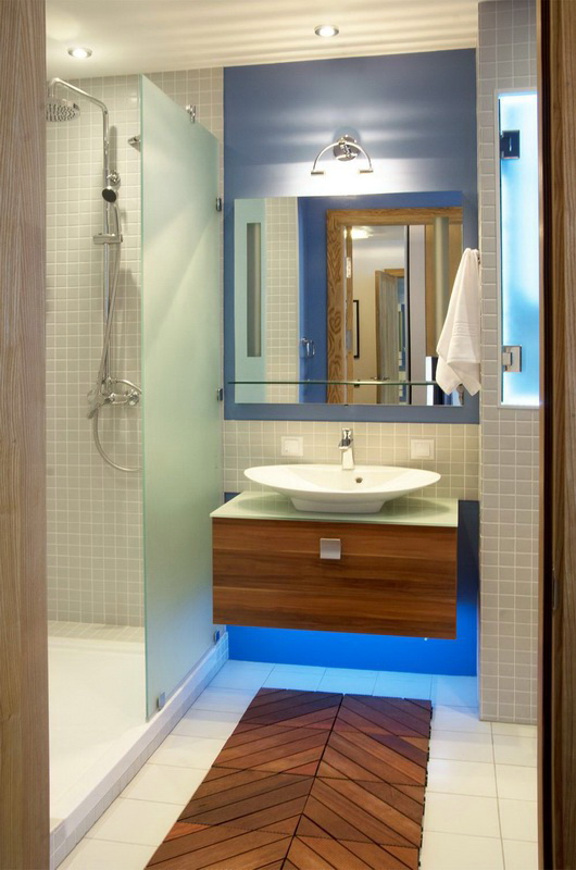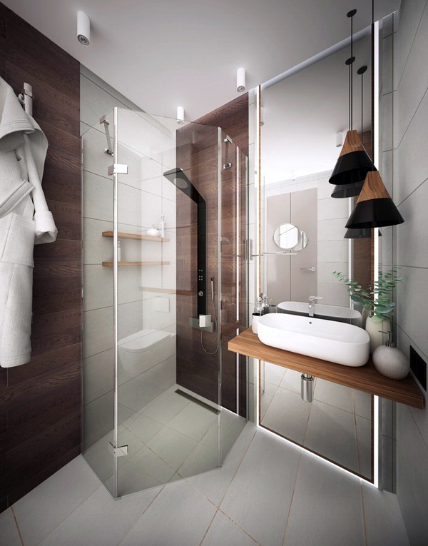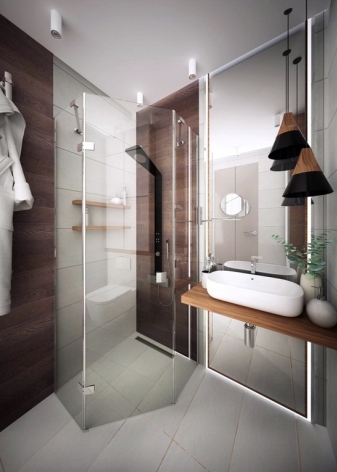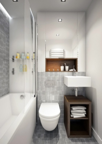Glauben Sie nicht, dass Ihr Projekt fehlgeschlagen ist, wenn der Raum klein ist. Im Gegenteil, in solchen Wohnungen können Sie Ihrer Phantasie Ausdruck verleihen, alles optimal, kompakt und stilvoll zu arrangieren. Dies gilt insbesondere für das Badezimmer. Hier können Sie eine reflektierende Glas- oder Spiegelfläche anbringen. Sie werden dazu beitragen, die Illusion von großem Raum in einem kleinen Raum zu schaffen.