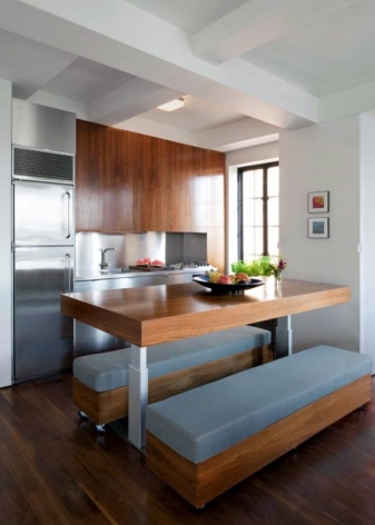 Um Platz in der Küche zu sparen, ist es besser, integrierte Geräte zu verwenden. Um Platz zu sparen, können Sie eine ausziehbare Konsole als Esstisch installieren. Sie können Utensilien in speziellen Wandschränken an der Decke aufbewahren.