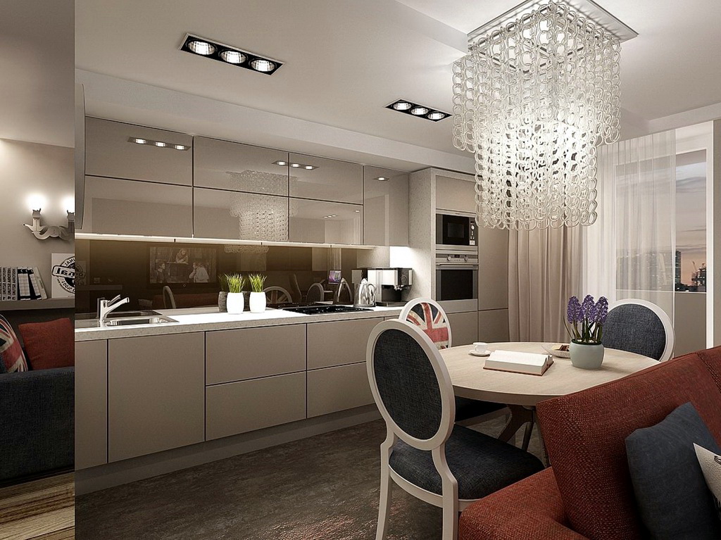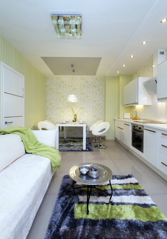 Das Layout einer kleinen Wohnung sollte auch eine Küche, einen Essbereich, ein Wohnzimmer beinhalten. Aufgrund der geringen Größe des Bereichs können Sie einige Zonen kombinieren. Die Dekoration der Küche sollte auch in einem allgemeinen Konzept mit einer einzigen Idee erfolgen. In diesem Fall kann der visuell funktionelle Bereich unter Verwendung einer anderen Farbe oder Schattierung getrennt werden. Zum Beispiel kann das Wohnzimmer in weiß gestaltet werden und die Küche kann in Pfirsich-, Türkis-, Blau- und Gelbtönen dekoriert werden.