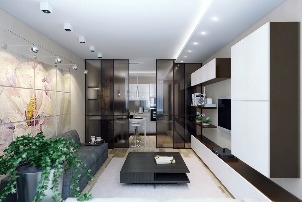 Oft haben Menschen, die ein Studio-Apartment kaufen wollen, Angst, Gerüche aus der Küche in andere Bereiche zu verbreiten. Dieses Problem ist ebenfalls gelöst. Eine Glastrennwand anbringen.So können Sie nicht nur dieses Problem lösen, sondern auch die Küche vor den Gästen verstecken. Glas hilft auch nicht den Raum zu verstopfen. Dies verleiht Ihrer Wohnung Leichtigkeit und Leichtigkeit.