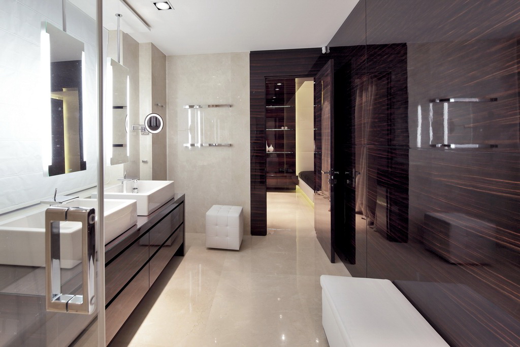 Im Funktionsbereich des Badezimmers können Sie auch die Stilelemente eines Konzepts kombinieren.So verleiht die Holzstruktur dem Interieur Individualität und Originalität, überschneidet sich organisch mit anderen Funktionsbereichen.