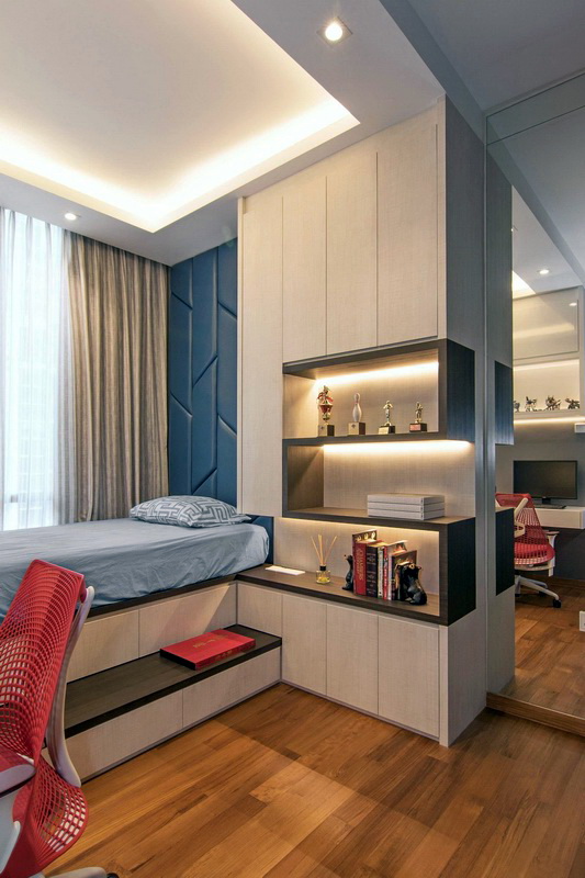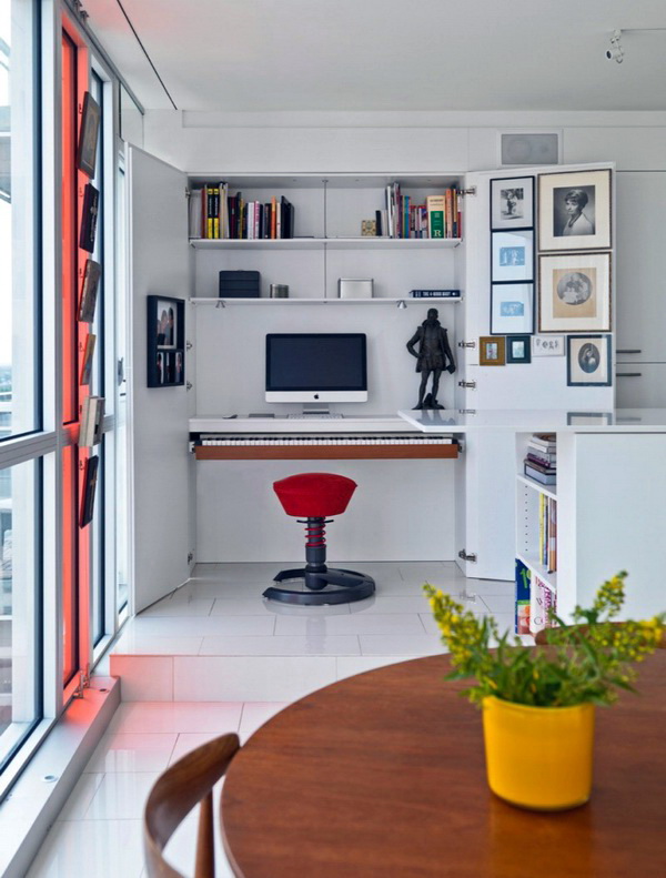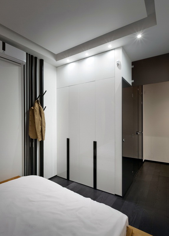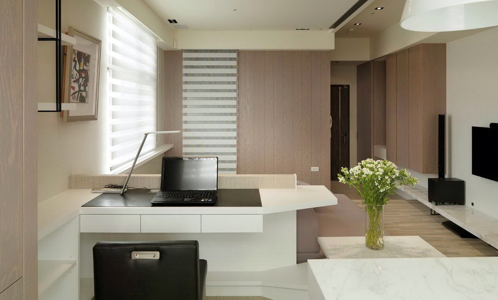 Zum Beispiel können Sie einen Arbeitsplatz neben dem Bett einrichten. Der Tisch kann in den Schrank eingebaut werden. Diese Option schützt die Bewohner während der Ferien perfekt vor der Technologie.Diese Art von Design wird die Fans von Feng Shui schätzen.