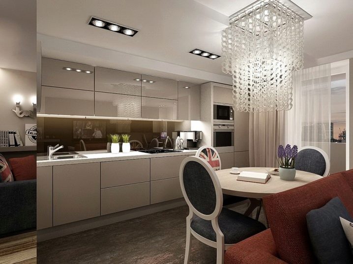 Um die Atmosphäre von Raum und Leichtigkeit in der Küche, die zum Beispiel aus dem Wohnzimmer kombiniert wird, zu bewahren, ist es notwendig, Schränke voller Höhe an einer Wand zu platzieren.Die Garderobe in hellen Farbtönen und der Kühlschrank ist ebenfalls an einer Wand platziert. Solche Möbel werden bequem für die Aufbewahrung der notwendigen Dinge für den Haushalt sein. Im Gegenteil, es wird eine Kochzone und eine bequeme Spüle geben.