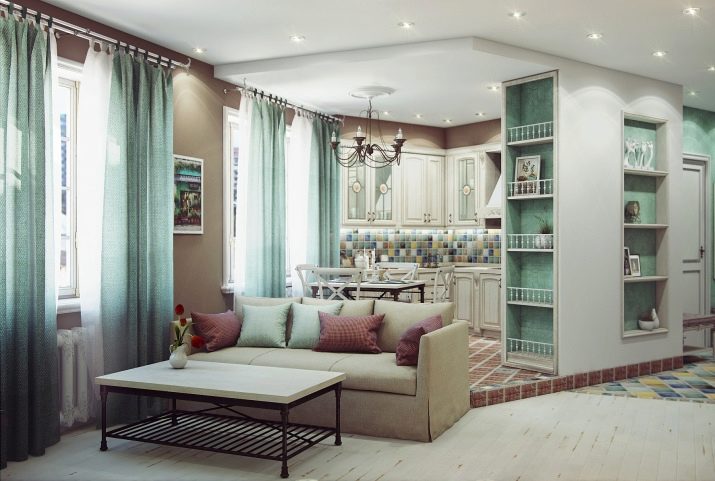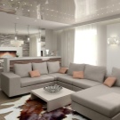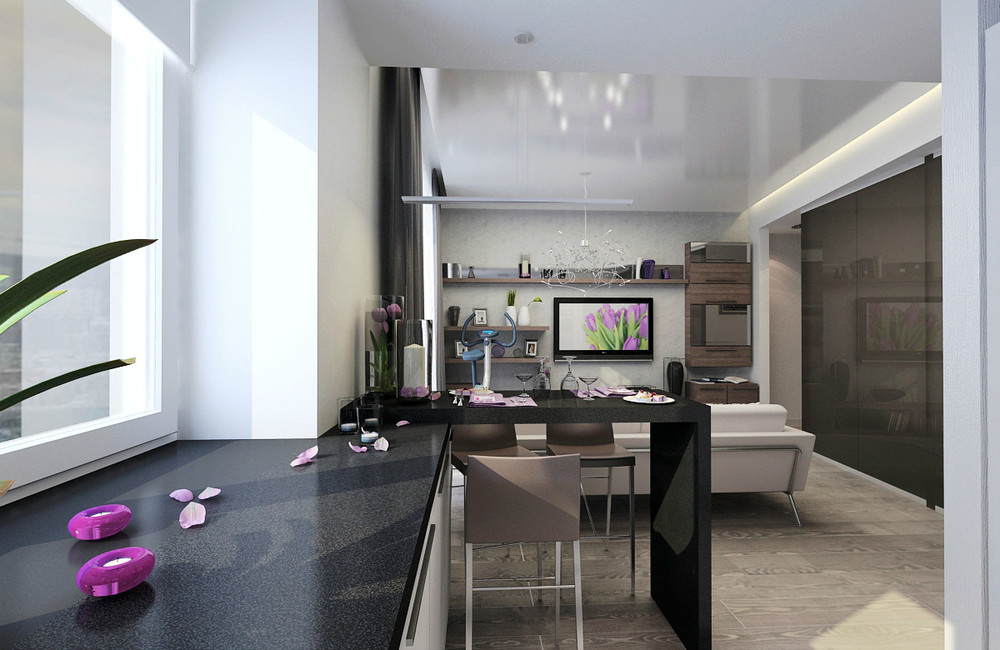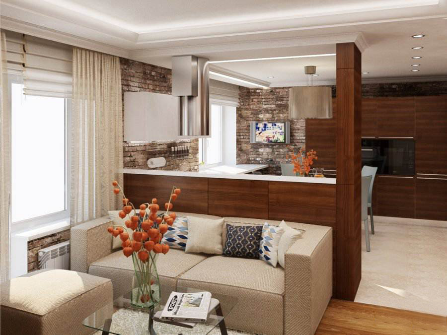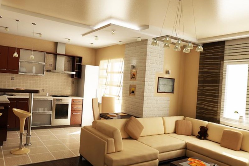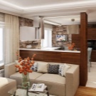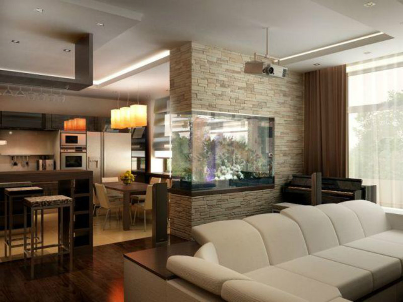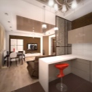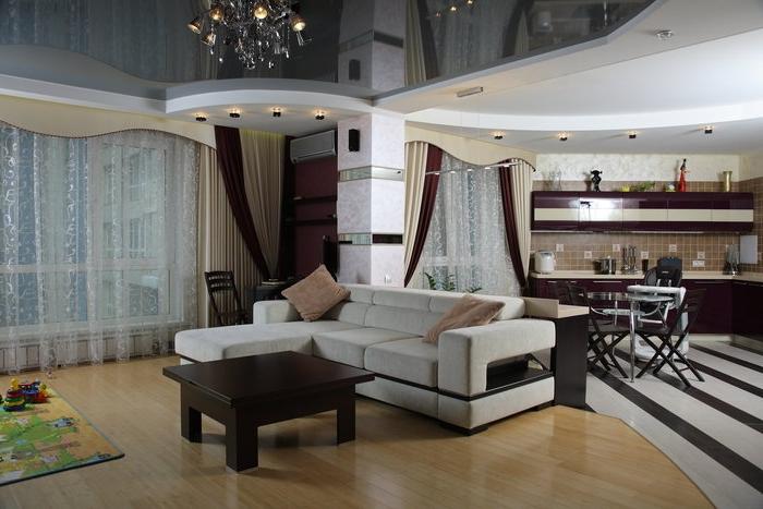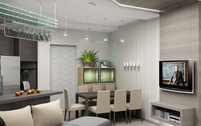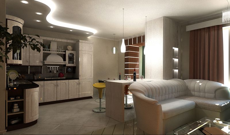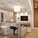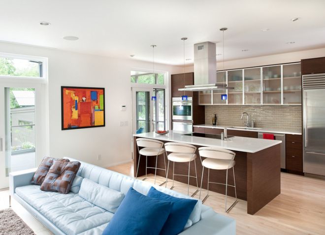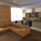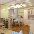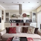 Ein weiteres Merkmal, das viele den Vorteil dieses Layouts betrachten: Die Küche und Wohnzimmer sind in der gleichen Wohngegend kombiniert. Dies ist praktisch auf Partys, wenn alles, was Sie brauchen, "zur Hand" ist, aber nicht immer angenehm wegen der Küchengerüche, die das Kochen zu Hause begleiten. Um dieses Problem zu beheben, müssen Sie ein gutes Belüftungssystem installieren. Um den Küchenraum optisch zu trennen, kann man den Boden an dieser Stelle aufrichten, so dass die Küche wie auf dem Podium erscheint.