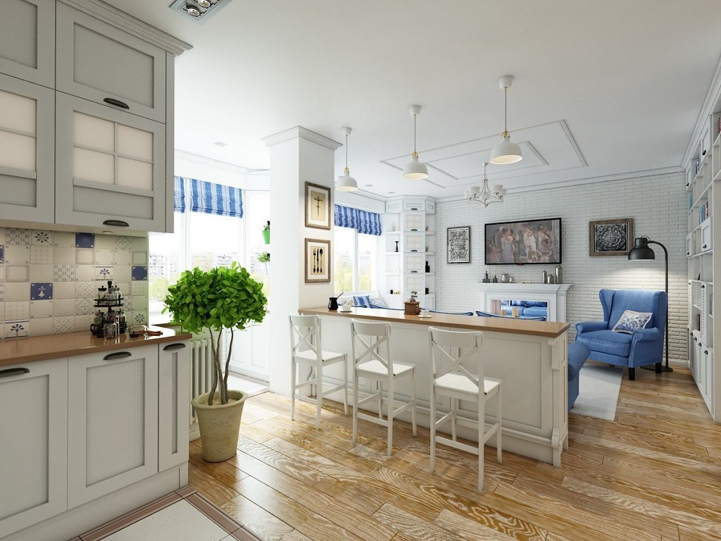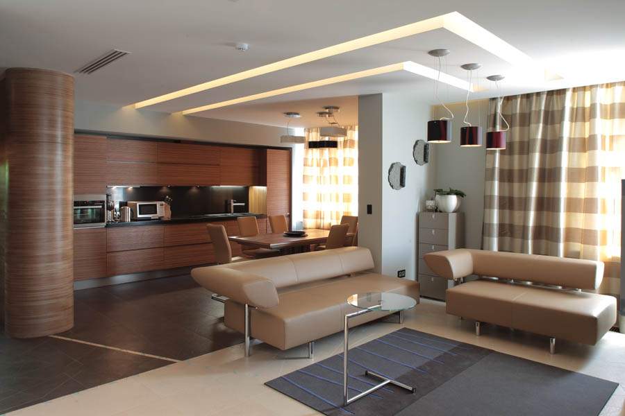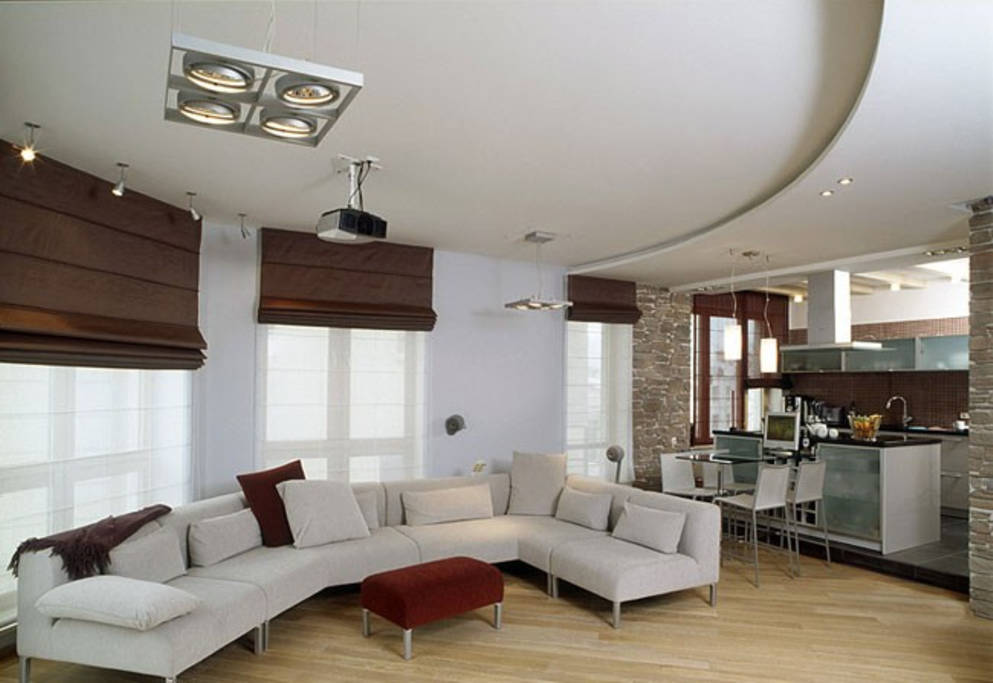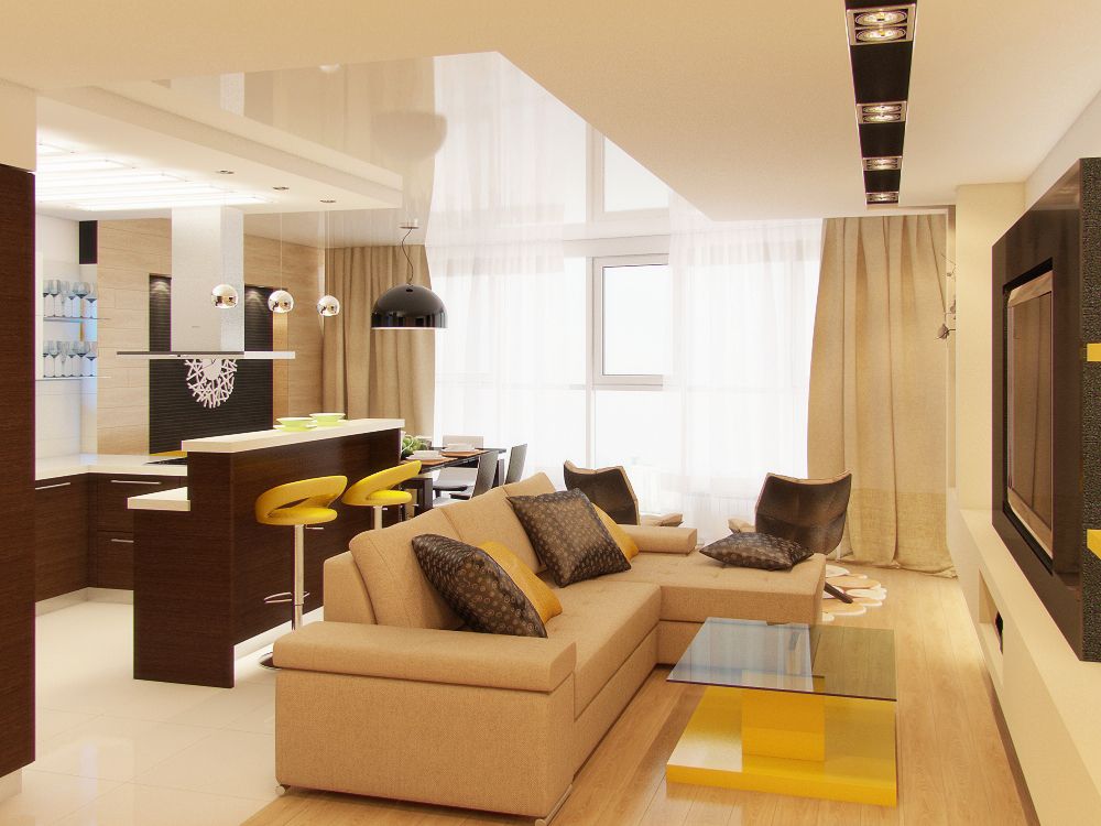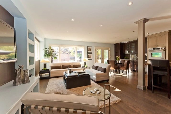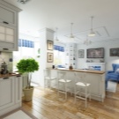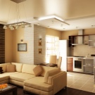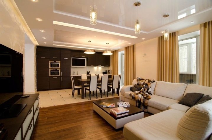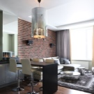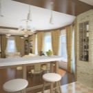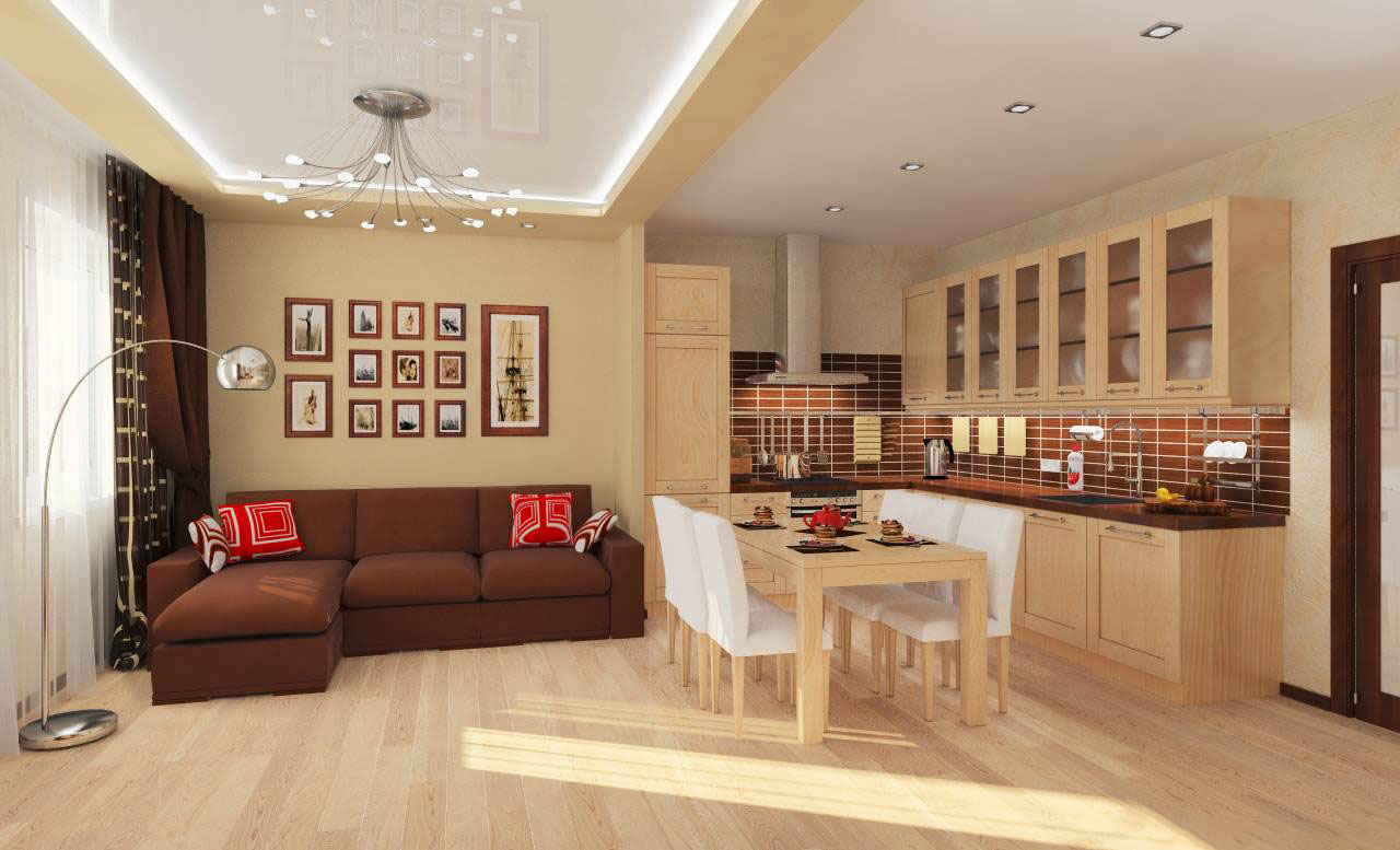 Ein weiteres Merkmal, das viele den Vorteil dieses Layouts betrachten: Die Küche und Wohnzimmer sind in der gleichen Wohngegend kombiniert. Dies ist praktisch auf Partys, wenn alles, was Sie brauchen, "zur Hand" ist, aber nicht immer angenehm wegen der Küchengerüche, die das Kochen zu Hause begleiten. Um dieses Problem zu beheben, müssen Sie ein gutes Belüftungssystem installieren. Um den Küchenraum optisch zu trennen, kann man den Boden an dieser Stelle aufrichten, so dass die Küche wie auf dem Podium erscheint.