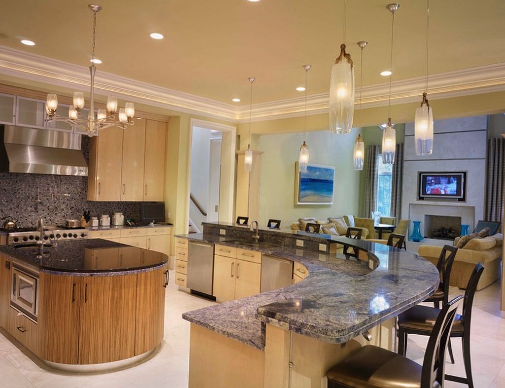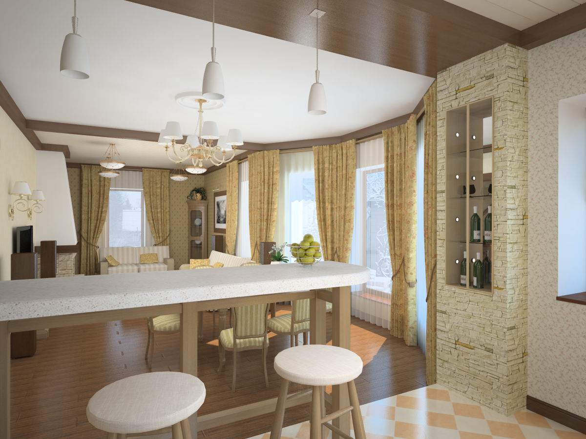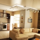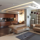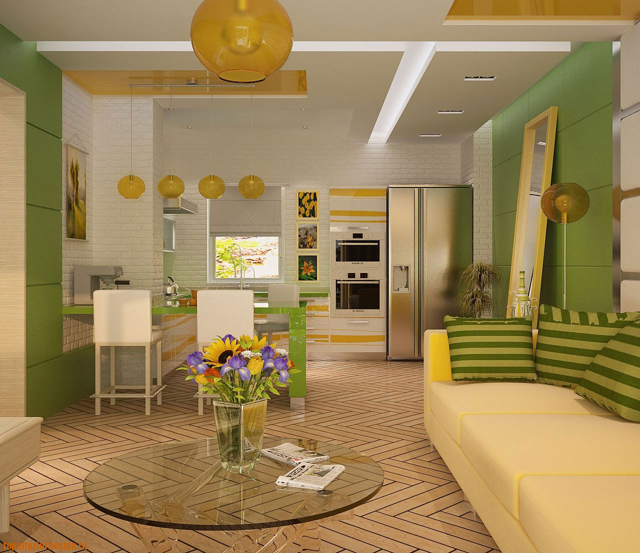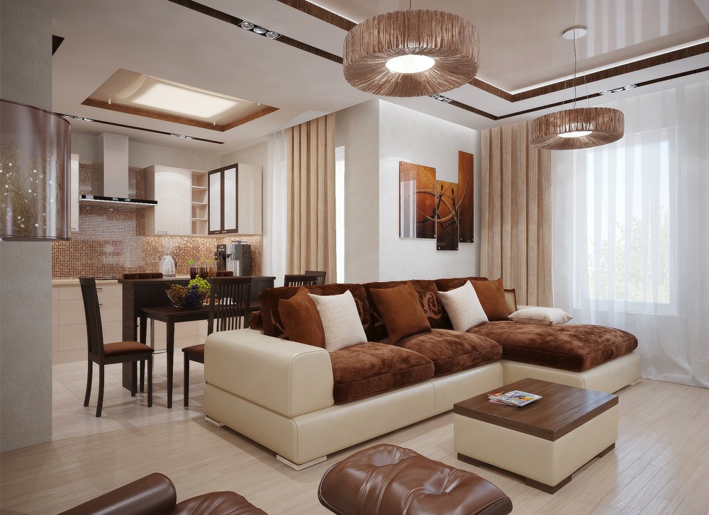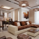 Ein weiteres Merkmal, das viele den Vorteil dieses Layouts betrachten: Die Küche und Wohnzimmer sind in der gleichen Wohngegend kombiniert. Dies ist praktisch auf Partys, wenn alles, was Sie brauchen, "zur Hand" ist, aber nicht immer angenehm wegen der Küchengerüche, die das Kochen zu Hause begleiten. Um dieses Problem zu beheben, müssen Sie ein gutes Belüftungssystem installieren. Um den Küchenraum optisch zu trennen, kann man den Boden an dieser Stelle aufrichten, so dass die Küche wie auf dem Podium erscheint.