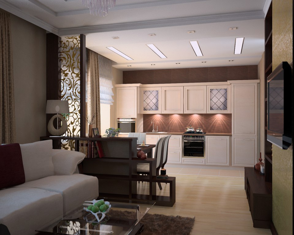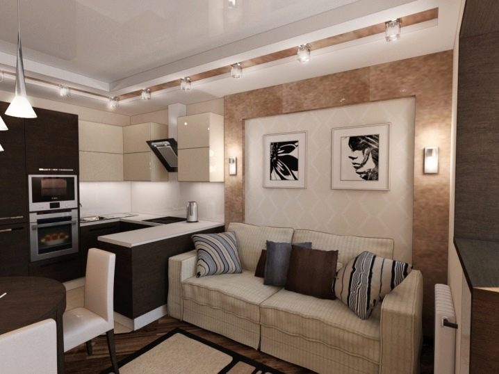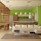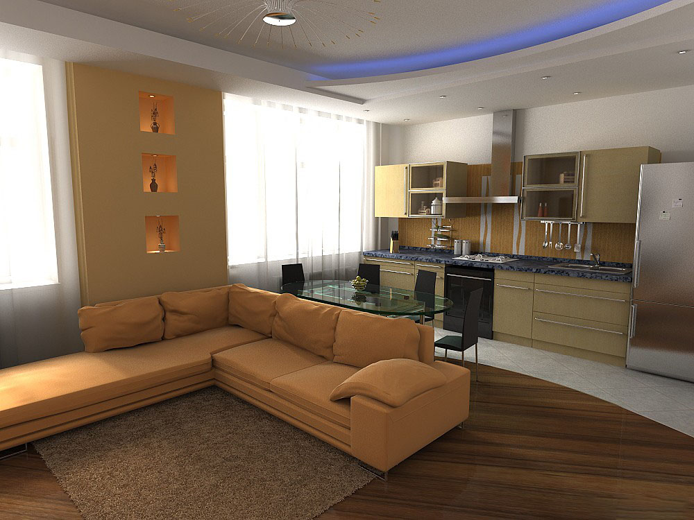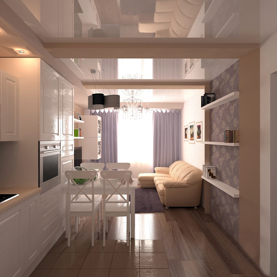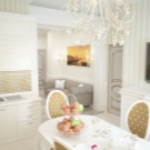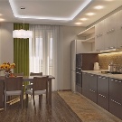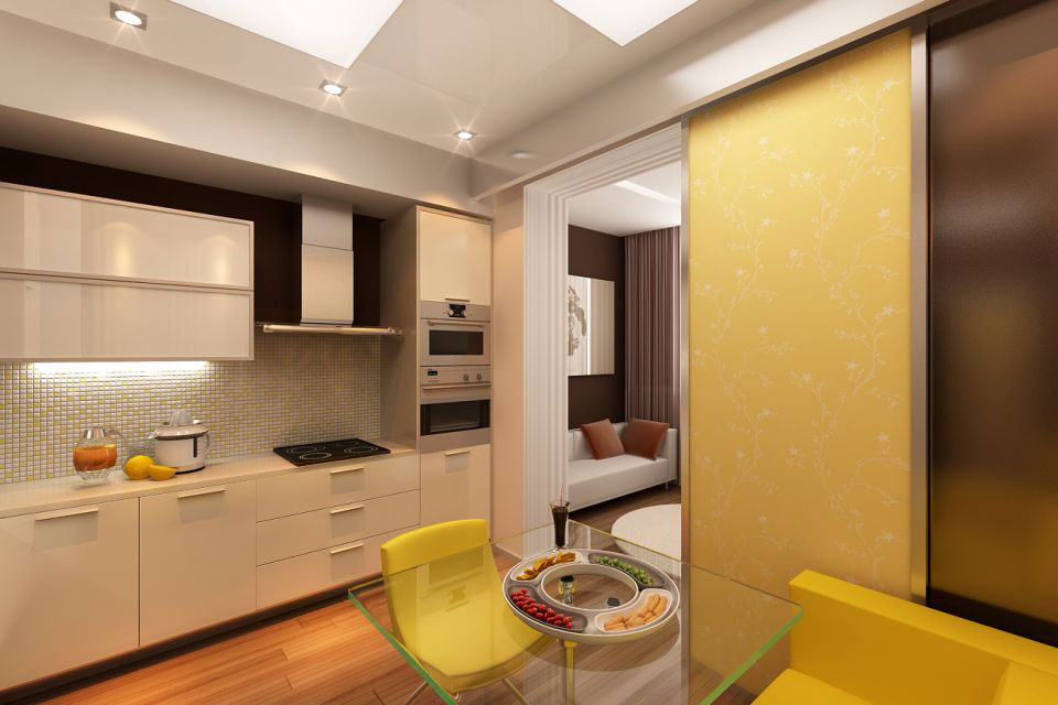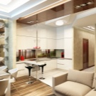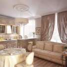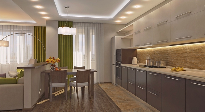 Wie für die Küche ist es besser, dass es offen ist, es wird Raumpräzision geben. Die beste Wahl ist eine modulare Küche mit einer großen Anzahl von Schließfächern, einem eingebauten Kühlschrank und einer Waschmaschine. Dies wird alles Wesentliche aus der Sicht verbergen. Die Abgrenzung des Küchenbereichs vom Wohnzimmer kann erreicht werden, indem die Wände des Küchenbereichs in einer dunkleren Farbe gestrichen werden, indem eine kombinierte Tapete in der Wohnung gewählt wird.
