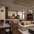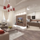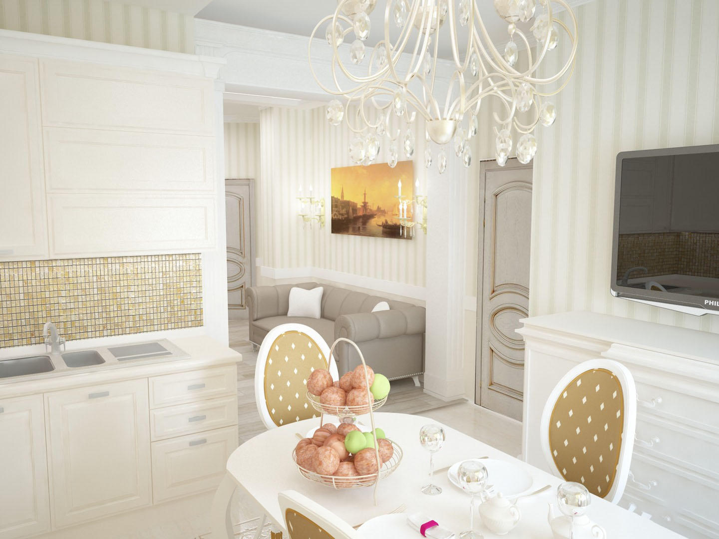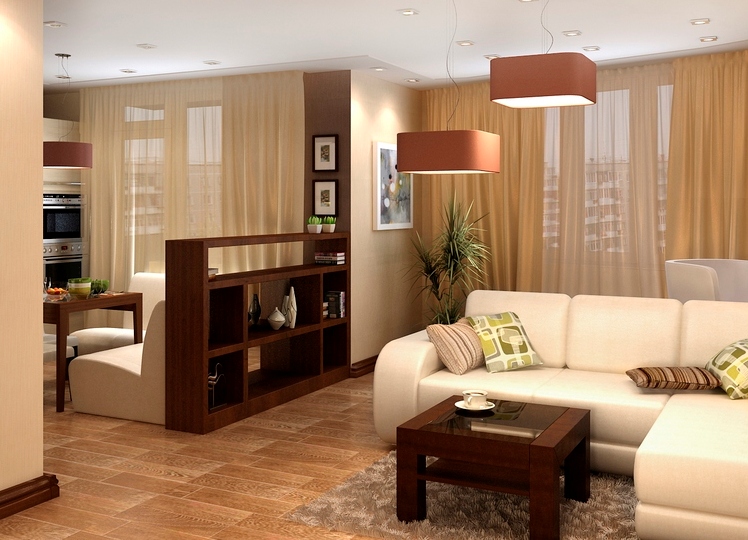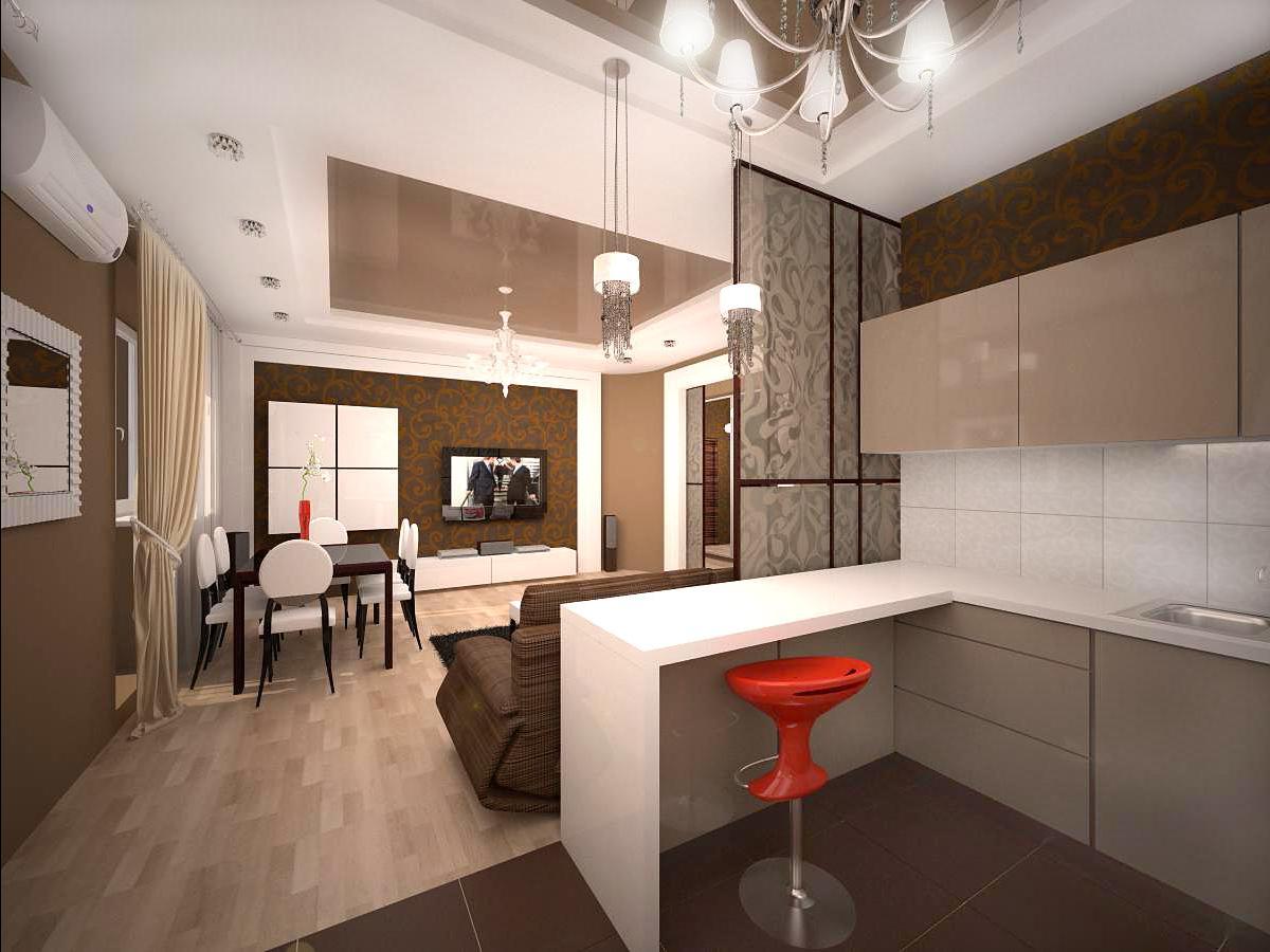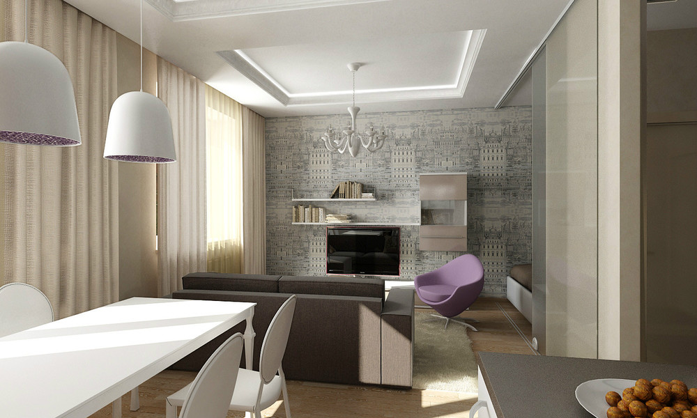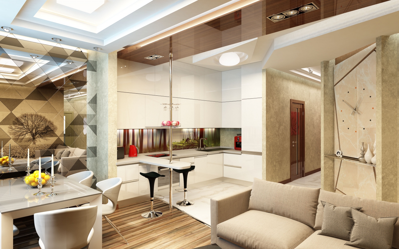Wie für die Küche ist es besser, dass es offen ist, es wird Raumpräzision geben. Die beste Wahl ist eine modulare Küche mit einer großen Anzahl von Schließfächern, einem eingebauten Kühlschrank und einer Waschmaschine. Dies wird alles Wesentliche aus der Sicht verbergen. Die Abgrenzung des Küchenbereichs vom Wohnzimmer kann erreicht werden, indem die Wände des Küchenbereichs in einer dunkleren Farbe gestrichen werden, indem eine kombinierte Tapete in der Wohnung gewählt wird.