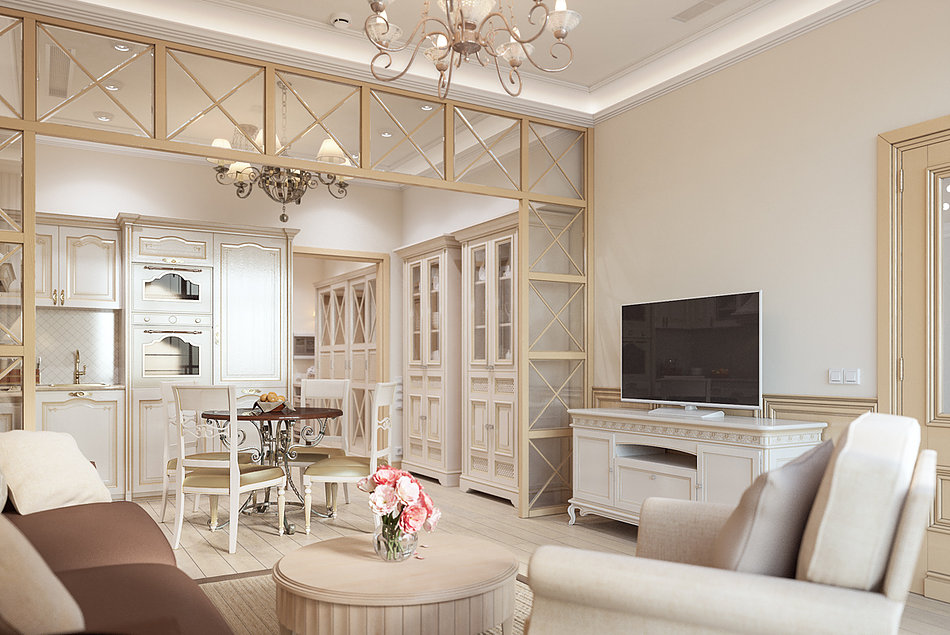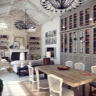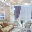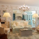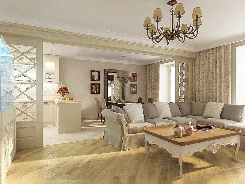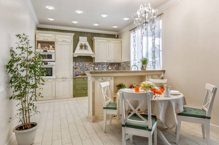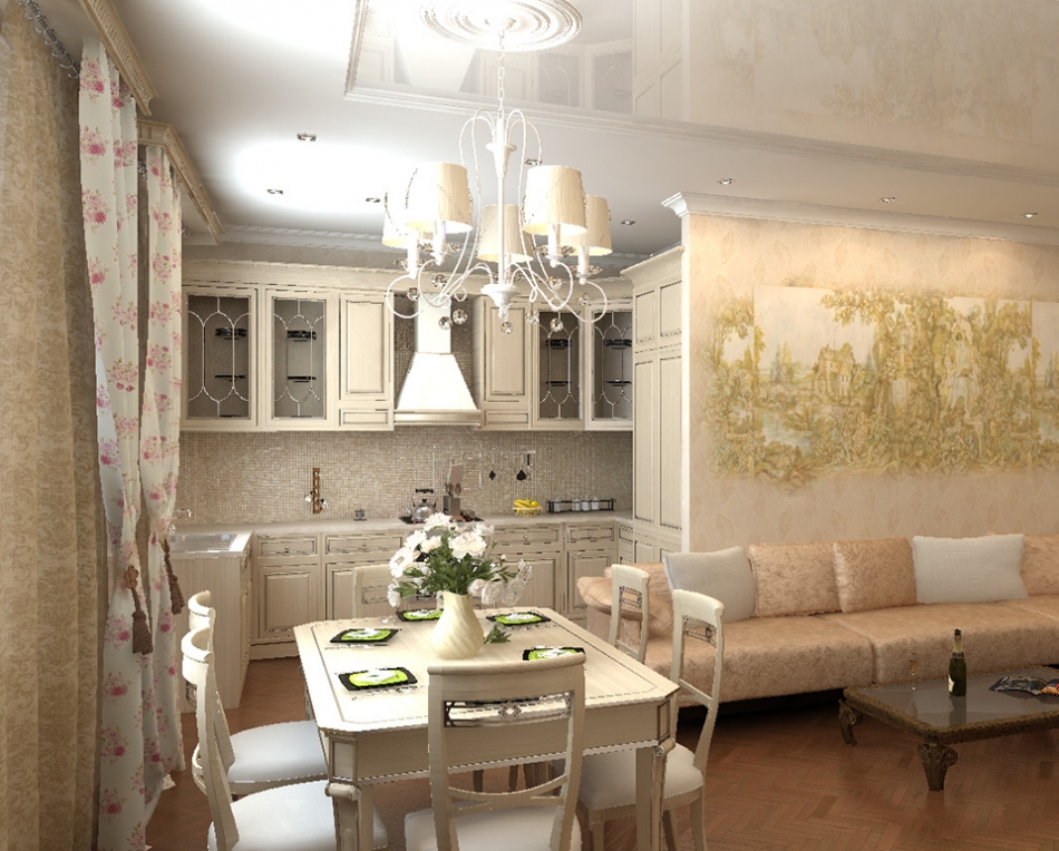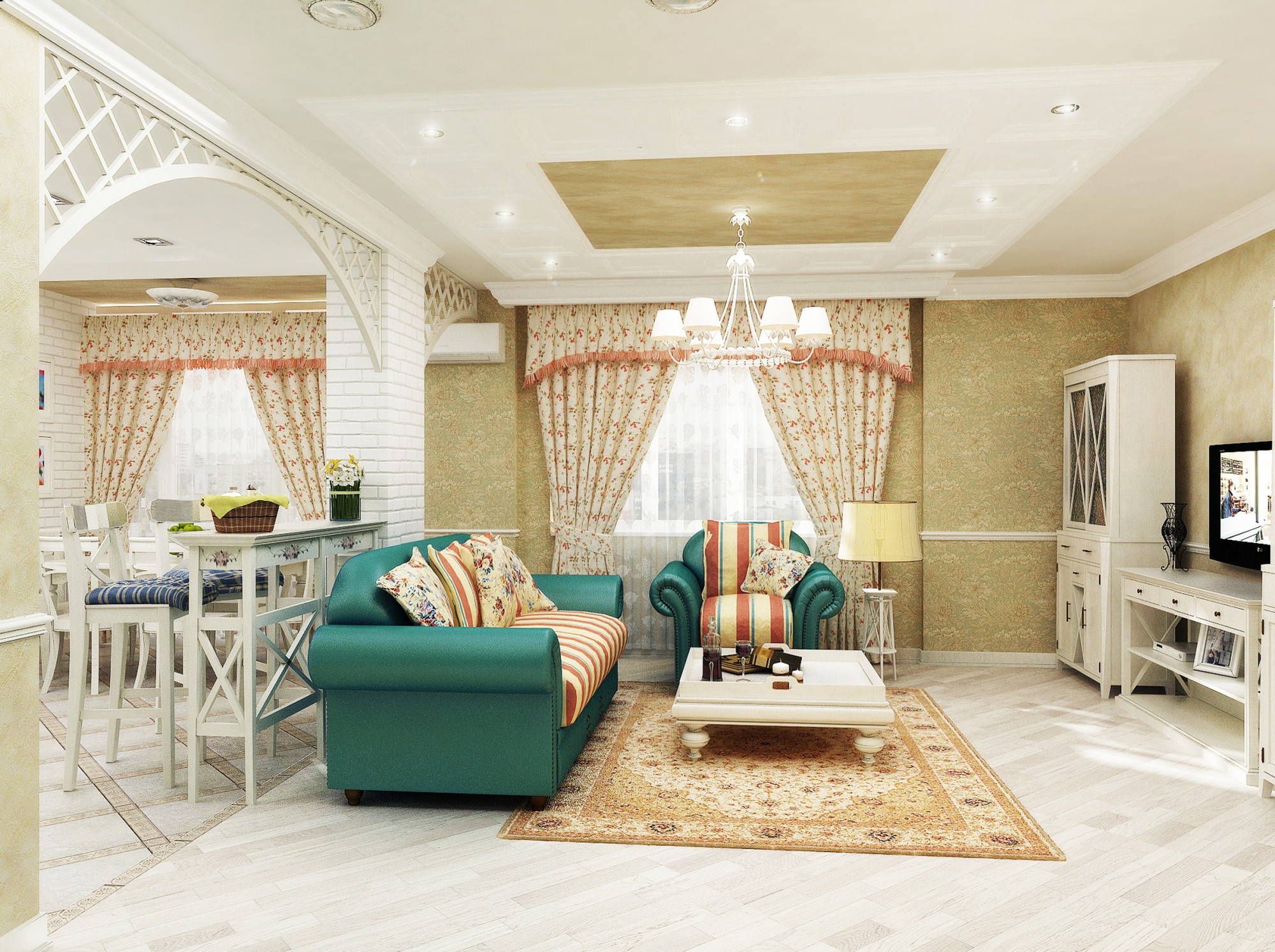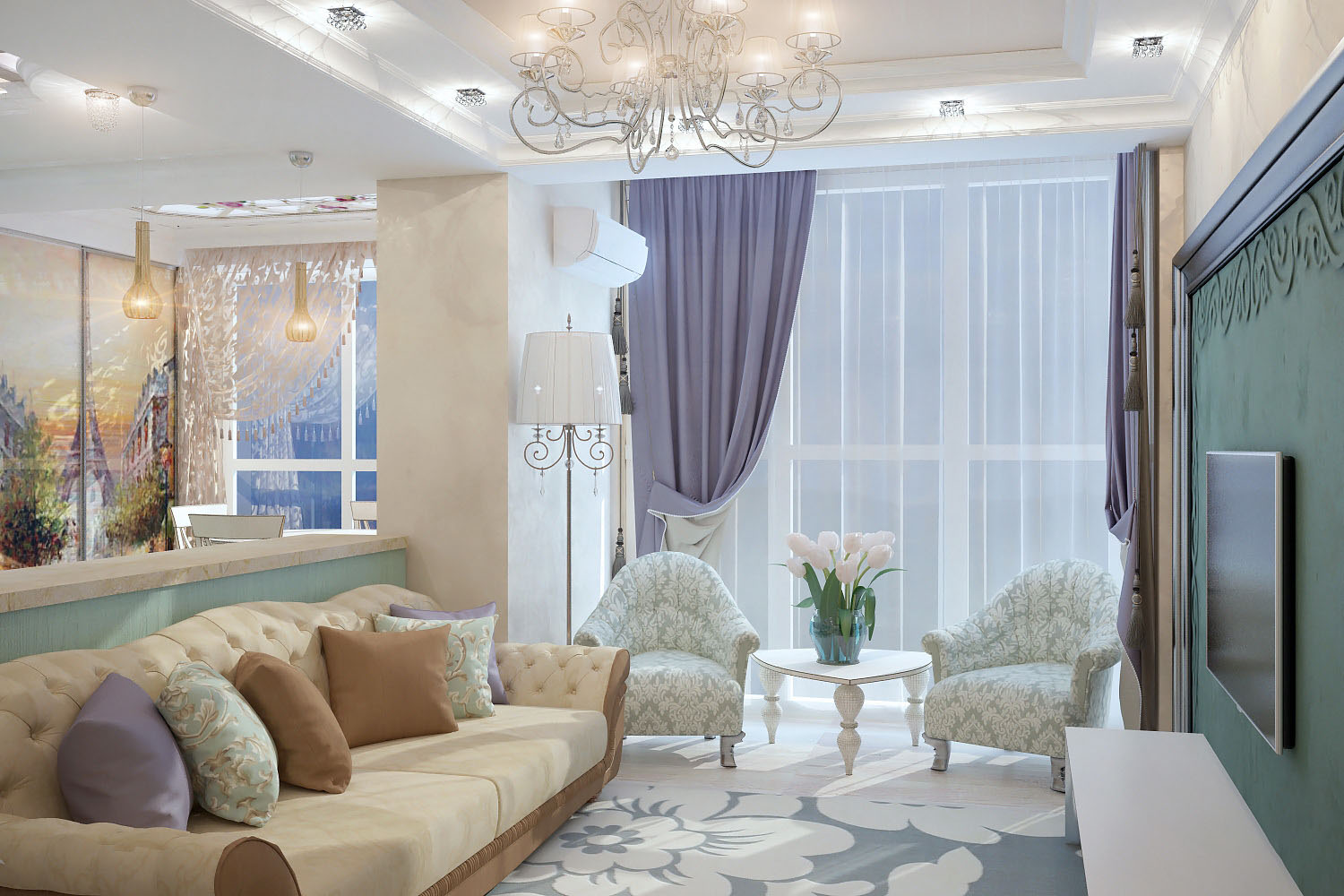 Stil "Provence" impliziert eine große Anzahl von hellen Möbeln, romantische Schleiervorhänge, Näharbeiten und Rüschen auf Tischdecken und Vordächern.Panorama-Fenster in voller Länge verleiht dieser Wohnung einen fabelhaften und aristokratischen Look. Dieser Eindruck wird verstärkt durch Antiquitäten und moderne Kommoden und Sofas, "antik" gemacht. Die zweistufige Decke betont die Luftigkeit des Raumes.