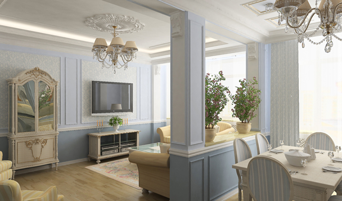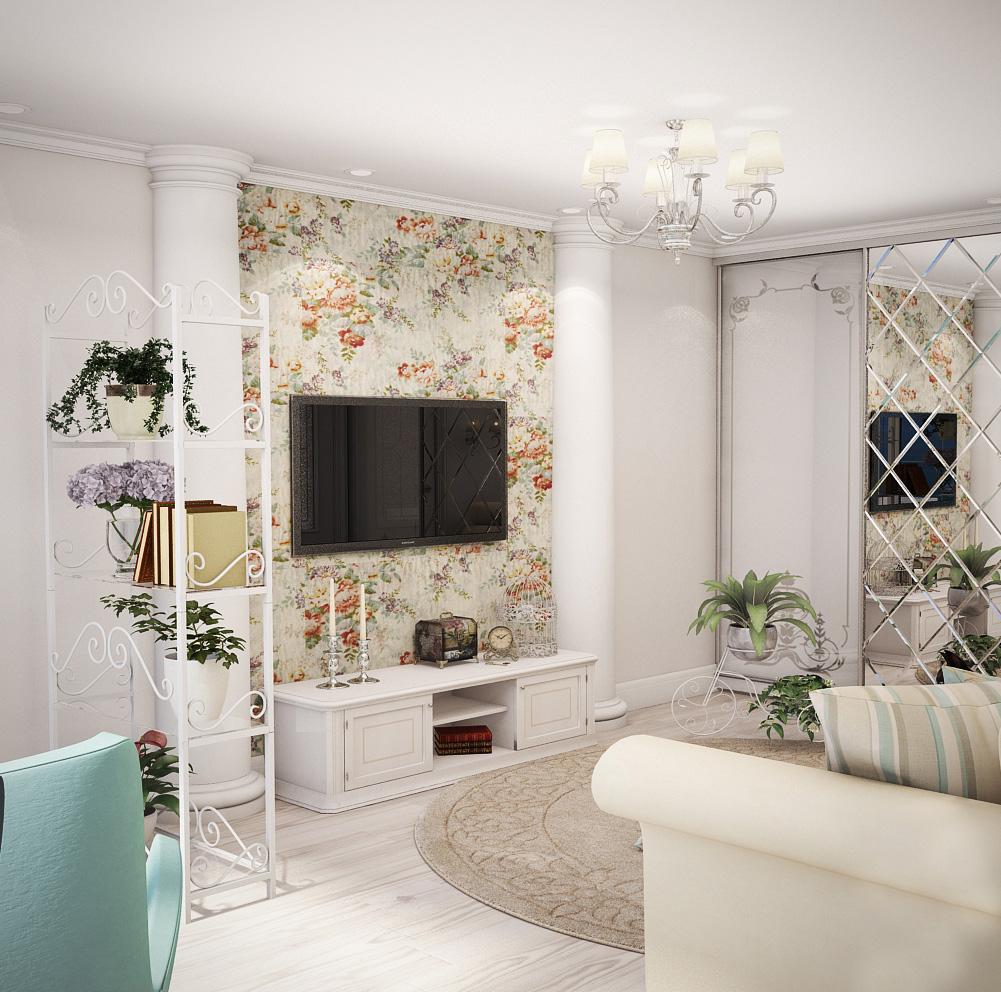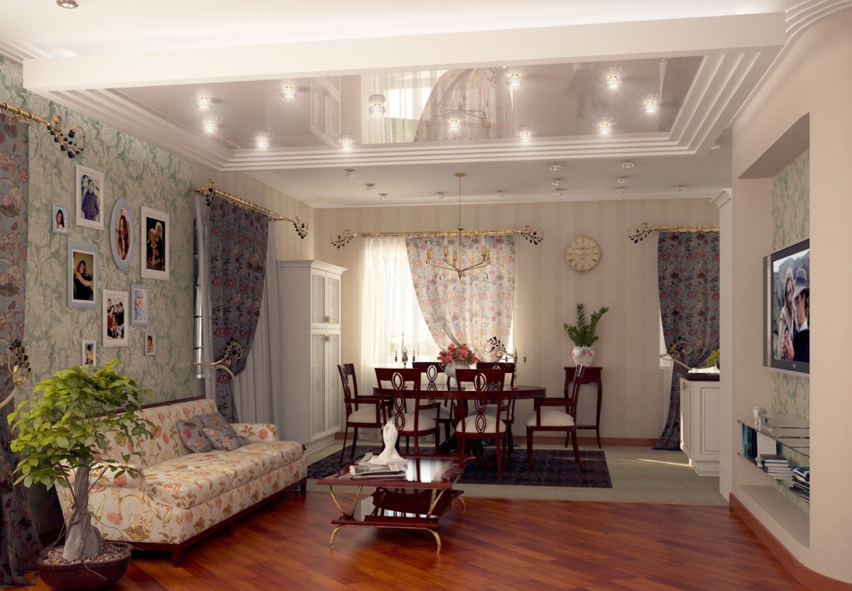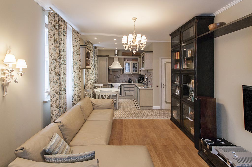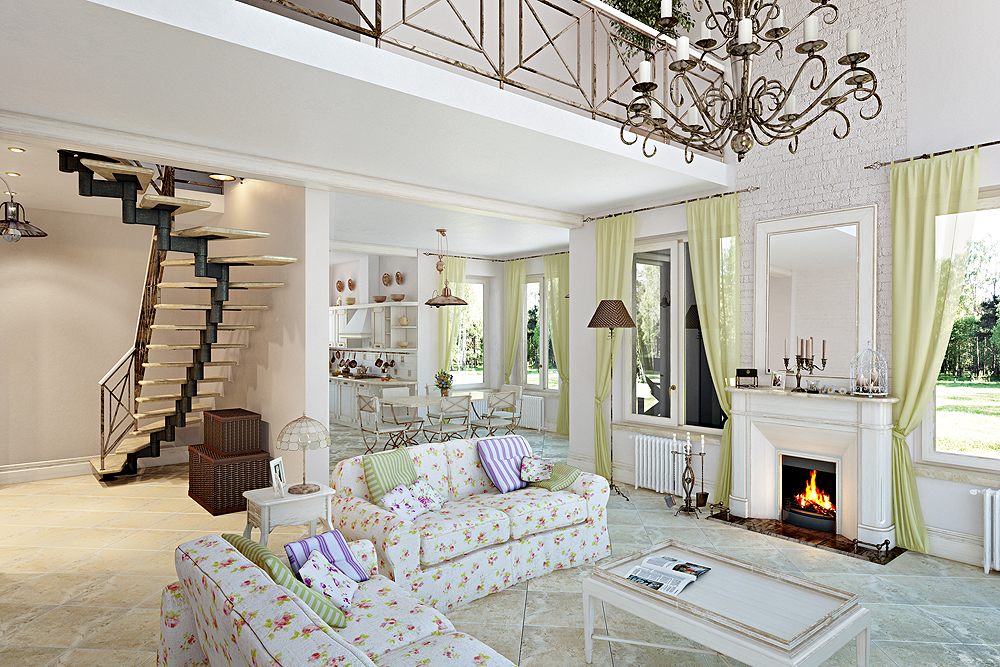 Stil "Provence" impliziert eine große Anzahl von hellen Möbeln, romantische Schleiervorhänge, Näharbeiten und Rüschen auf Tischdecken und Vordächern.Panorama-Fenster in voller Länge verleiht dieser Wohnung einen fabelhaften und aristokratischen Look. Dieser Eindruck wird verstärkt durch Antiquitäten und moderne Kommoden und Sofas, "antik" gemacht. Die zweistufige Decke betont die Luftigkeit des Raumes.