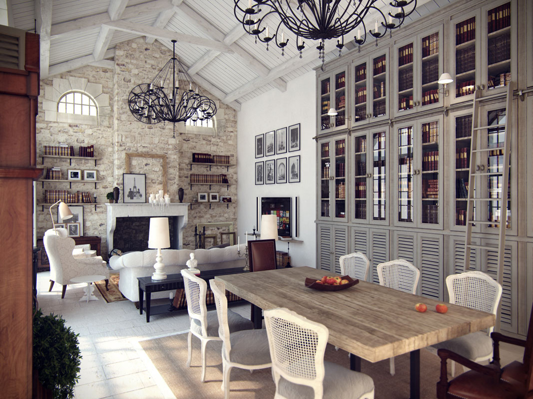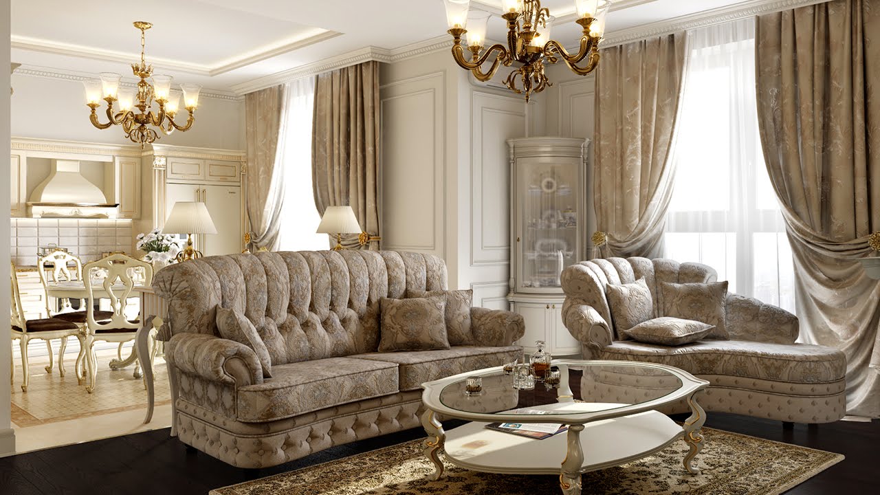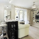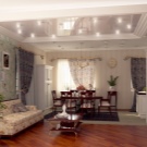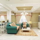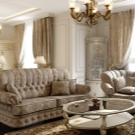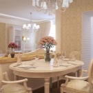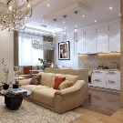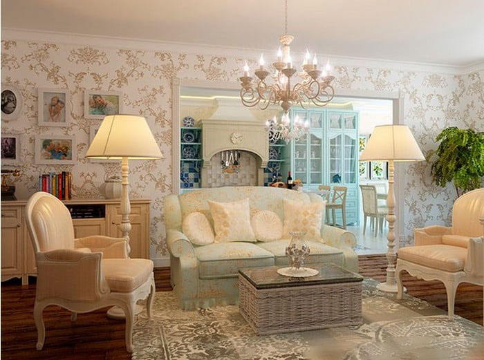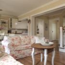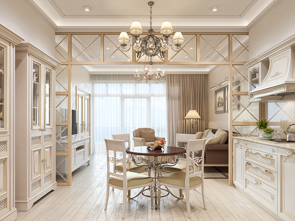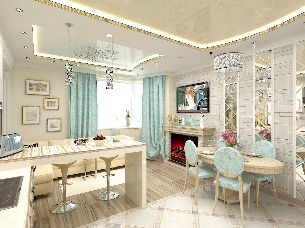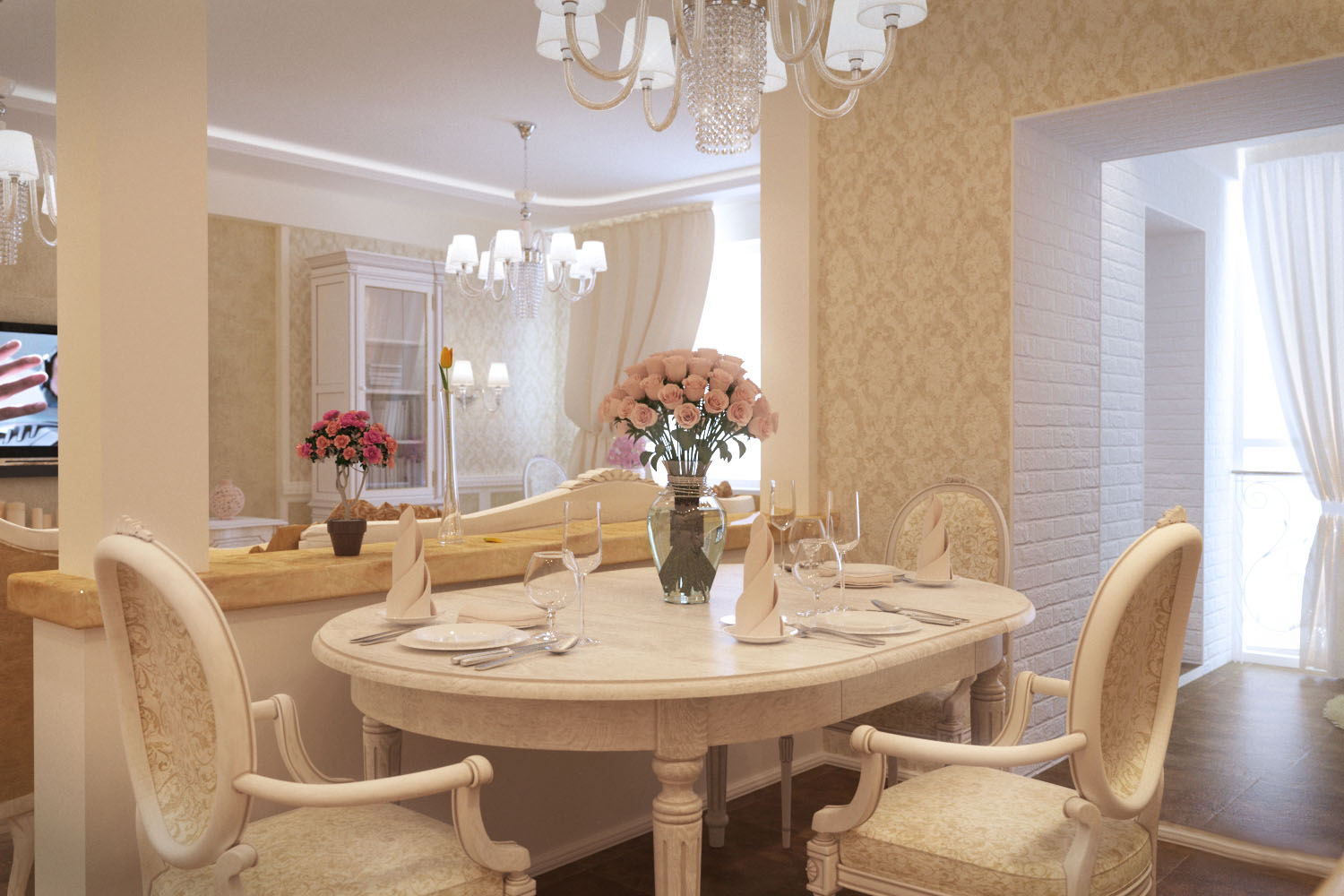 Stil "Provence" impliziert eine große Anzahl von hellen Möbeln, romantische Schleiervorhänge, Näharbeiten und Rüschen auf Tischdecken und Vordächern.Panorama-Fenster in voller Länge verleiht dieser Wohnung einen fabelhaften und aristokratischen Look. Dieser Eindruck wird verstärkt durch Antiquitäten und moderne Kommoden und Sofas, "antik" gemacht. Die zweistufige Decke betont die Luftigkeit des Raumes.
