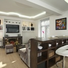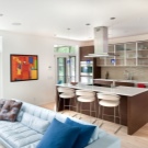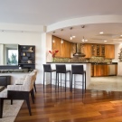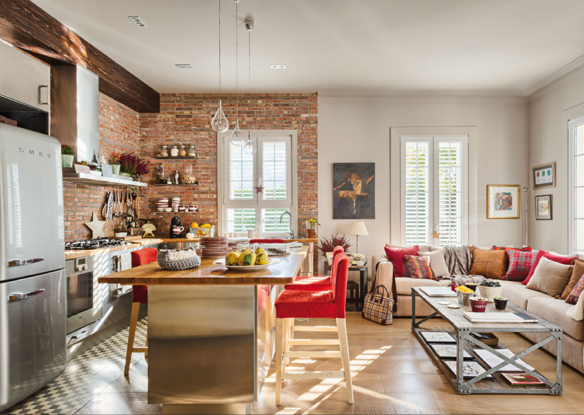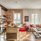 Stilbeschreibung Loft Es sollte mit dem Vorhandensein von bewusst rohen, unbearbeiteten Teilen im Inneren beginnen, zum Beispiel Blechlüftungsleitungen, die unter der Decke der Wohnung verlaufen. Die Fenster verdecken gleichzeitig die Jalousien, der Boden ist in der Regel aus Holz oder mit Fliesen im Küchenbereich kombiniert. Die modulare Küche ist mit einer Arbeitsplatte aus Granit oder Marmor ausgestattet, die im allgemeinen Farbschema gestaltet ist.und ist vom Wohnzimmer Bar Bereich eingezäunt.