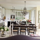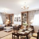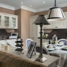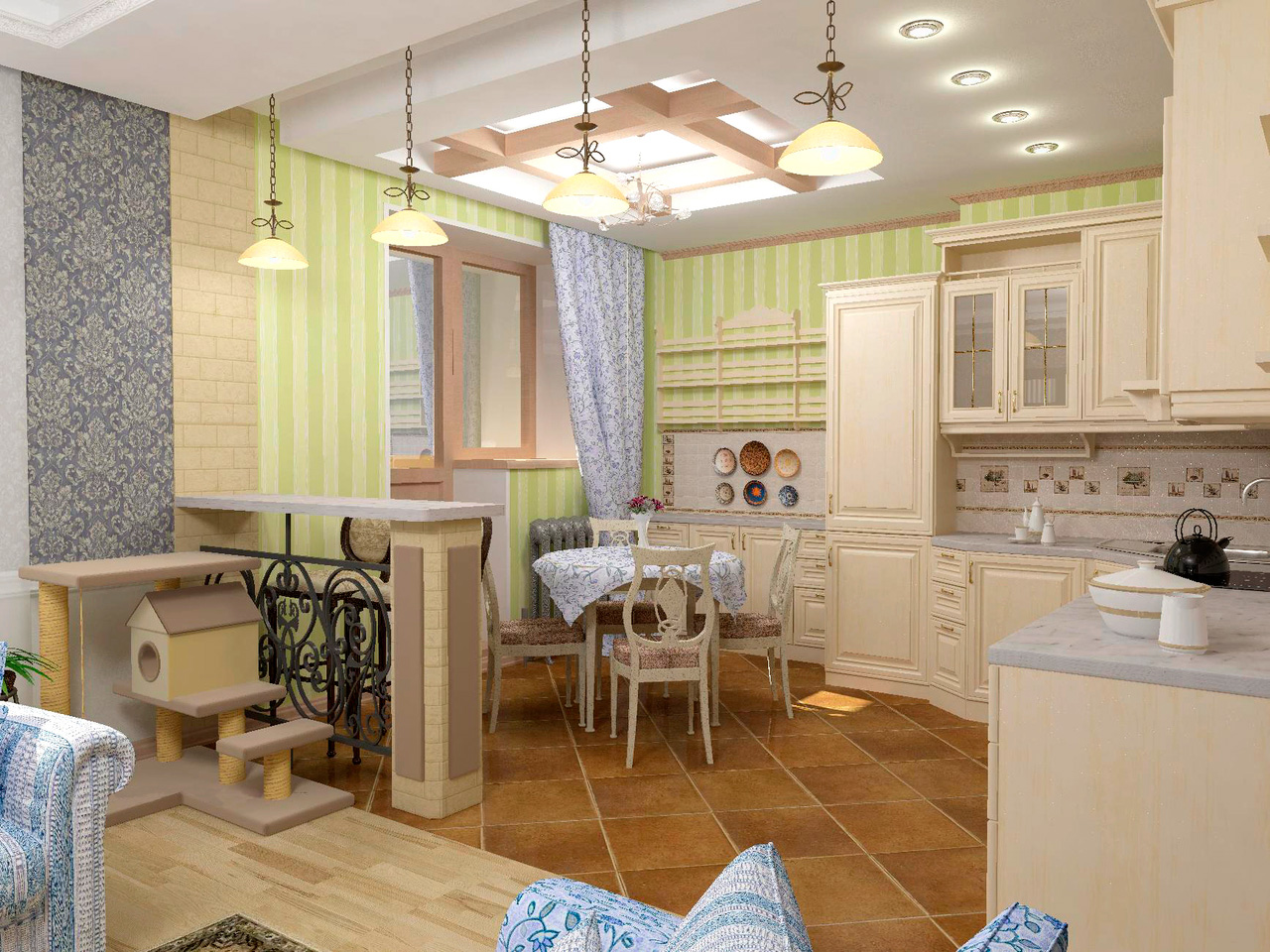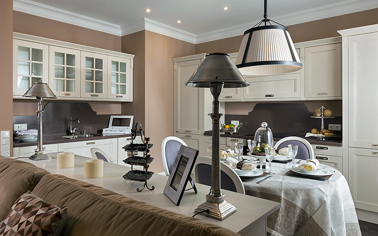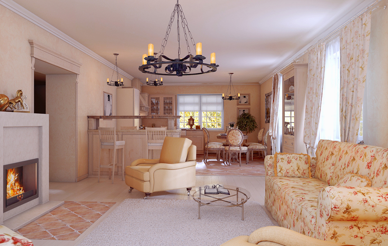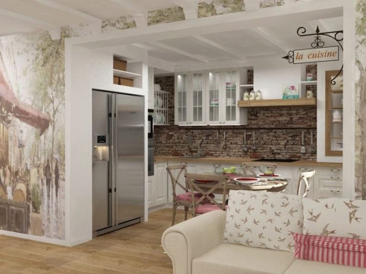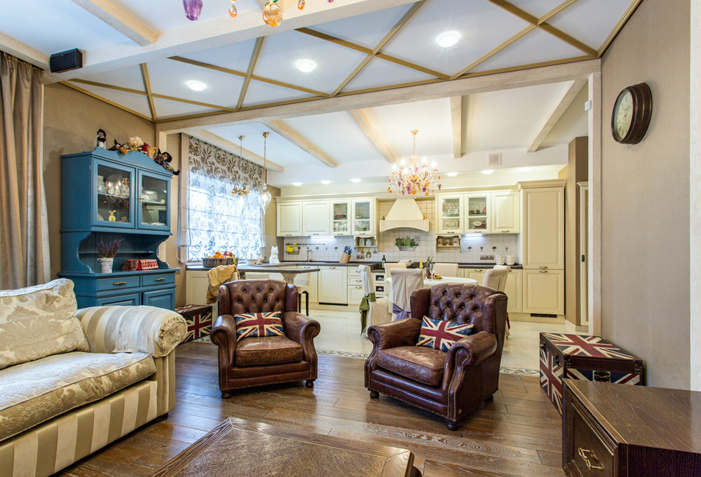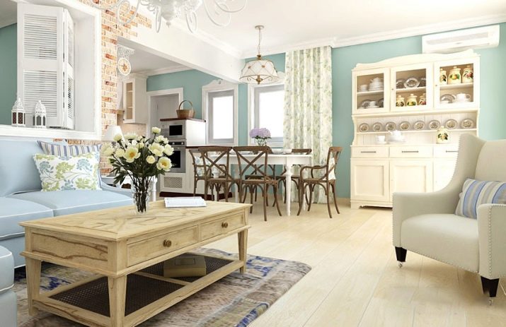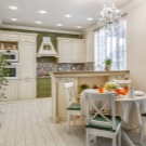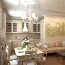Heller Farbfleck kann gepolstertes Sofa und Stühle sein, gemacht von den dunklen materiellen praktischen Tönen. In dieser Wohnung müssen Blumen vorhanden sein, entweder lebendig, oder in Form von Stichen oder Drucken auf Wandteppichen. Die Küche in diesem Stil wird harmonisch aussehen, wenn die Möbel mit natürlichem Furnier versehen sind, dessen Farbe die Schattierungen der Holzteile der Sessel und des Sofas widerspiegelt. Solch ein Interieur wird für den Aufenthalt von einem jungen romantischen Menschen gewählt werden.