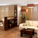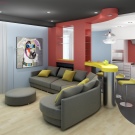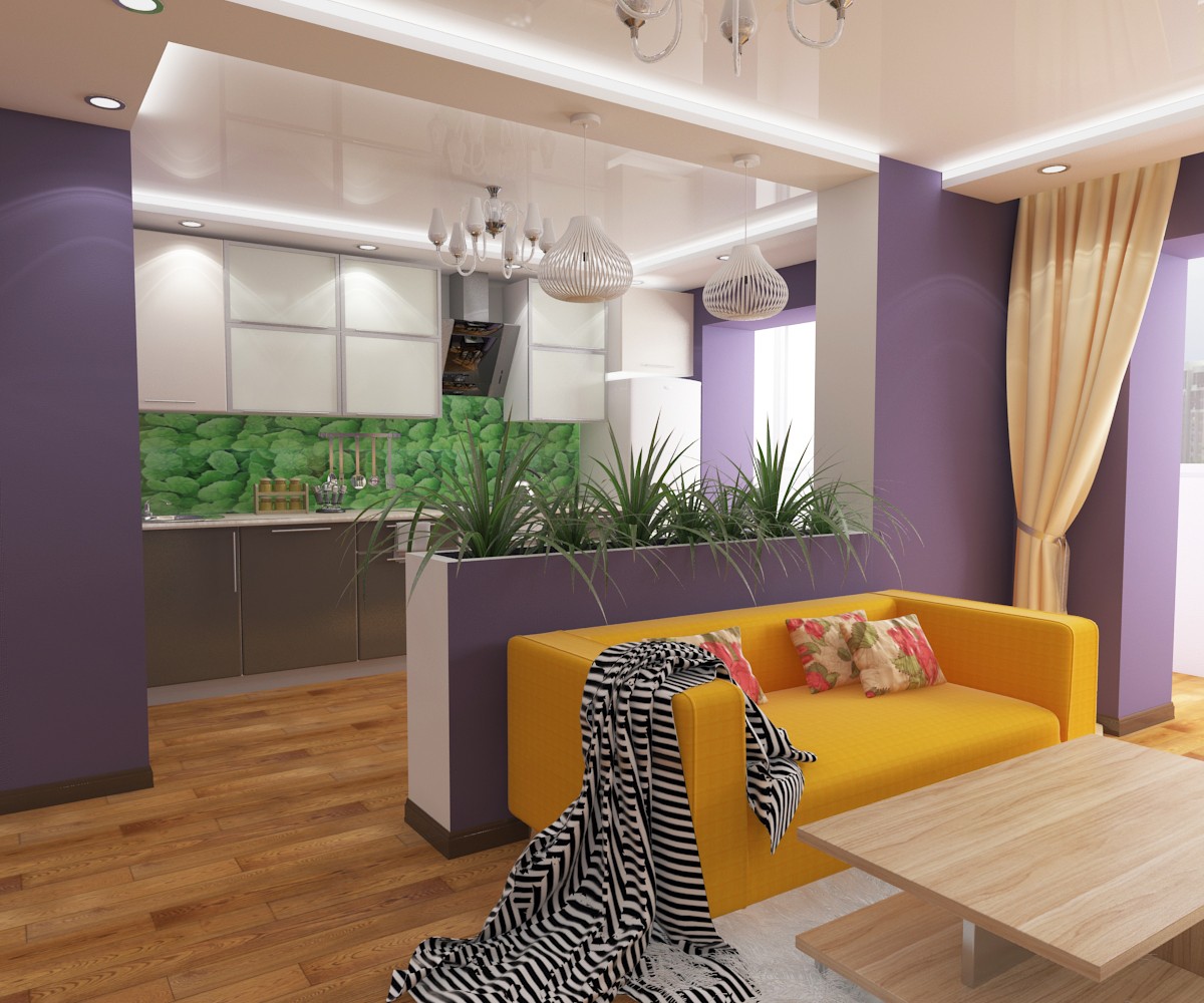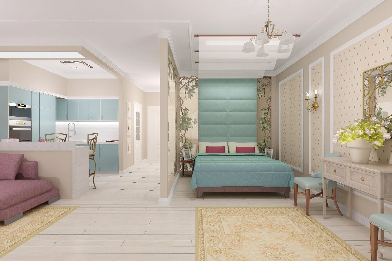 Innerhalb der Wohnung - das Studio existieren keine klaren Grenzen von Wohngebieten, sie fließen nahtlos ineinander über. In der Regel gibt es vier Zonenrichtungen (mit Ausnahme des Badezimmers, das hinter den Türen versteckt ist):