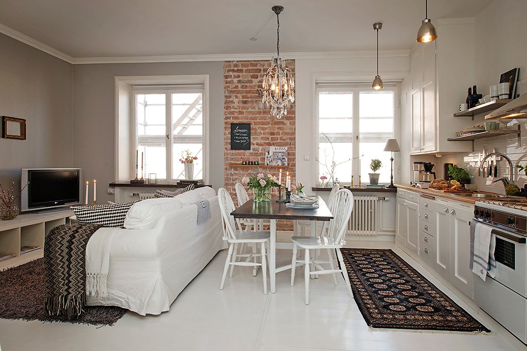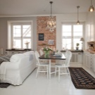 Stil Fusion ermöglicht eine Mischung aller Arten von Trends und Trends. Die Hauptsache ist, sich innerhalb der Grenzen des Zumutbaren zu halten, um nicht lächerlich und geschmacklos zu wirken. Der gemauerte Teil der Wand sieht harmonisch genug aus, was ein antikes Plüschsofa und einen Tisch mit einer gestrickten Tischdecke mit einem romantischen Abendessen mit Kerzen umfassen kann. Die Decke mit eingebauten Lichtern und einem Kronleuchter - ein Ventilator ist durchaus mit schwarzen und weißen Tapeten in der Küche zulässig.