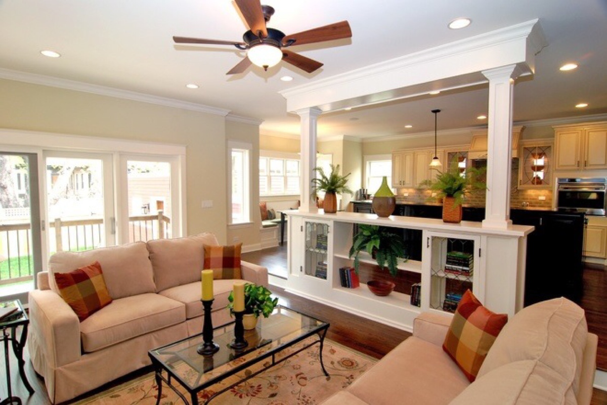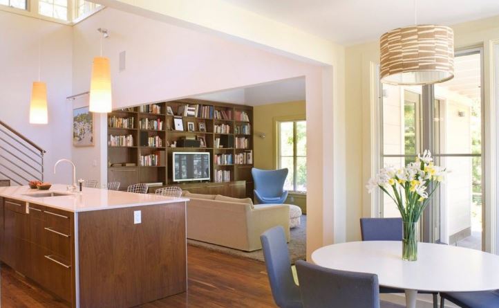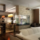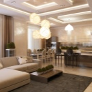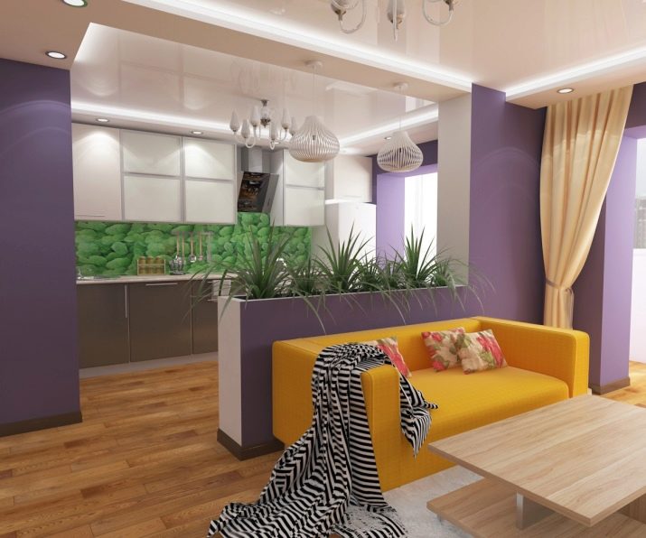 Um sicherzustellen, dass in einem Raum, der in Bereiche unterteilt ist, es hell und luftig ist, helfen Sie zahlreichen Lampen, einschließlich Außenlampen; und das Vorhandensein von gedämpften Lichtzonen.
