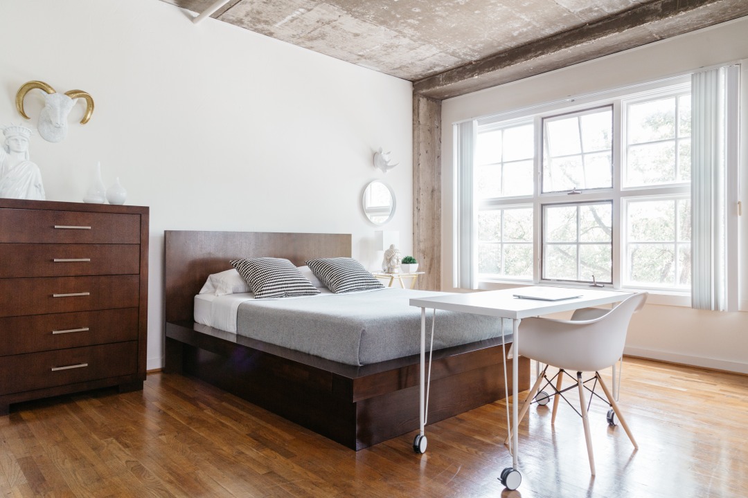 Zunächst empfehlen die Studios bei der Gestaltung einer Wohnung, die Lage des Schlafbereichs zu bestimmen und die Lage des Bettes zu bestimmen. Dann überlegen Sie, wie Sie das Bett vom Rest des Raumes trennen.