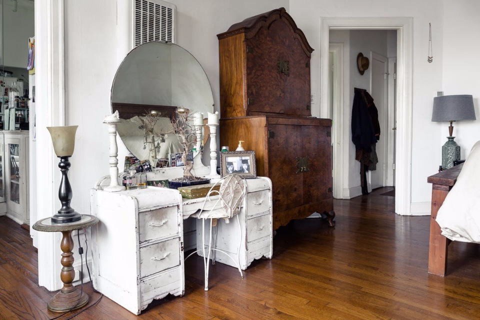 Art Deco kann als der romantischste und raffinierteste Stil im modernen Design bezeichnet werden. Im zwanzigsten Jahrhundert wurde es zum Synonym für Glamour und Luxus im Design. Ein handgefertigtes Bett aus massivem Holz, eine antike Kommode und ein geschnitzter Tisch ermöglichen es der Gastgeberin, sich wie ein echter Pariser zu fühlen. Das Sofa und der Sessel, in einem Second-Hand-Laden gekauft, mit einer Patina von Zeit bedeckt, betonen die Atmosphäre der Antike und Geheimnis. Französische Fenster schmücken Töpfe mit Blumen und Jalousien.
