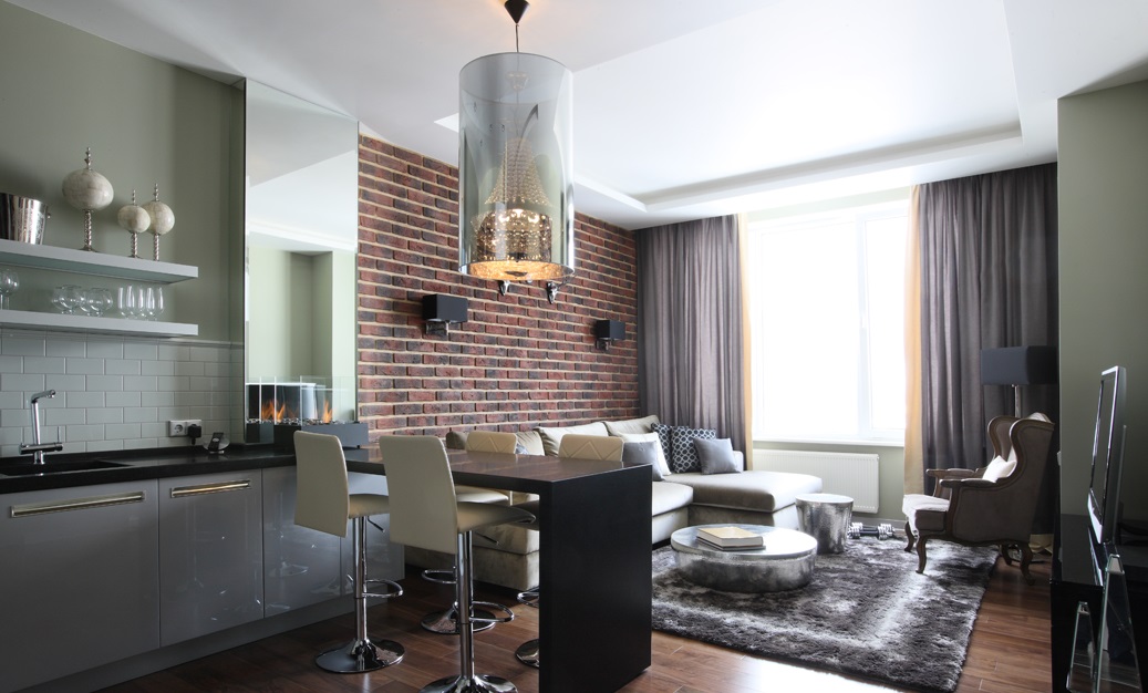 Schwere Gardinen an den Fenstern sind farblich abgestimmt mit Imitation des Kamins und Gravuren an groben Ziegelwänden. Der Küchenbereich kann in einem praktischen "Techno" -Stil hergestellt werden, der am praktischsten ist, um Sauberkeit zu gewährleisten. Der Schlafbereich in einer solchen Wohnung wirkt meist sehr elegant, in sanften Pastelltönen gehalten und bringt romantische Träume. Das Brautpaar wird diesen Stil wählen und die Individualität jedes Einzelnen unterstreichen.