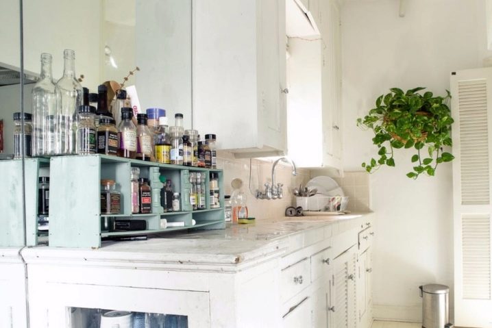 Romantischer Trockenbaubogen trennt den Küchenbereich vom Wohnzimmer. Möbel in der Küche bestehen aus zahlreichen Regalen, Regalen und Schränken, sie ist bewusst schäbig und mit schönen lockigen Griffen ausgestattet.Um ein ähnliches Studio-Apartment auszustatten, müssen Sie eine Menge Zeit und Mühe investieren, sorgfältig und mit Seele wählen Sie Elemente der Einrichtung und Möbel. Apartment für den wahren Vertreter von Böhmen, empfindlich für Bewertungen und Bewertungen.