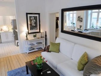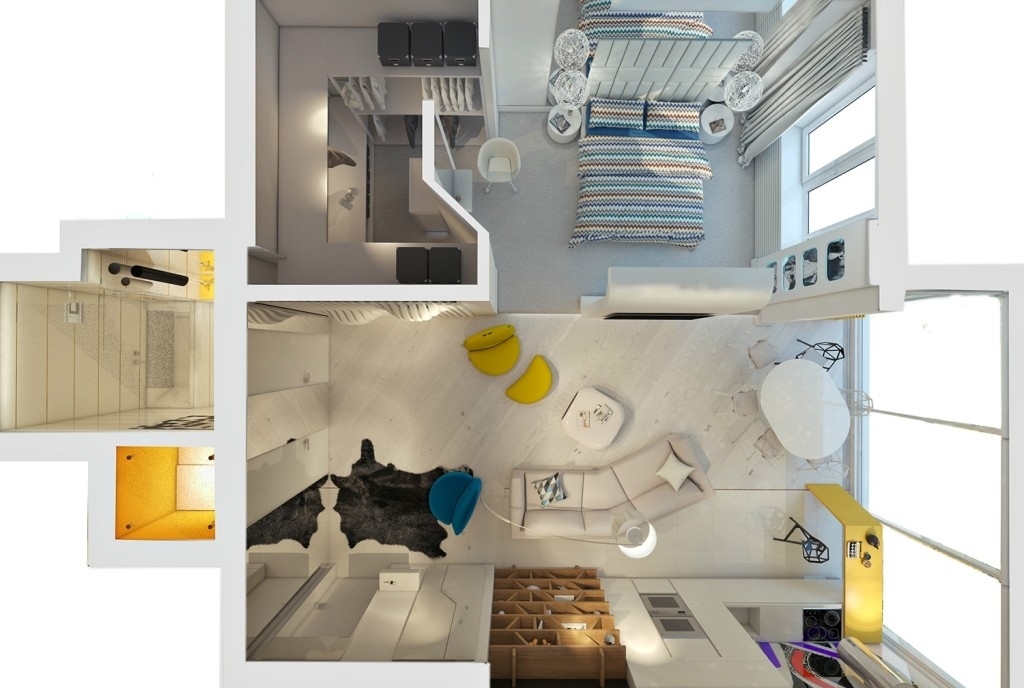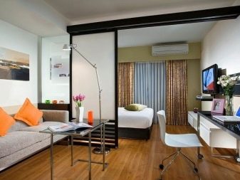 - Studiomöbel müssen mobil, umformbar, klappbar, auf Rädern gekauft werden. Denn wenn Sie sogar alle Trennwände durchbrechen, aber die gesamte Fläche mit sperrigen Möbeln ausstatten, wird sich nichts ändern.