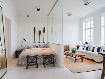 Im Studio können Sie über eine transparente Partition eine Ecke für das Heimbüro auswählen. Und es gibt einen Platz für Arbeit, und vollständige Isolierung wird vermieden, wie in gewöhnlichen Wohnungen. Es wird interessant sein, wenn die Teilung kreativ angegangen wird. Platzieren Sie die Partition beispielsweise in einem Winkel von 45 Grad.