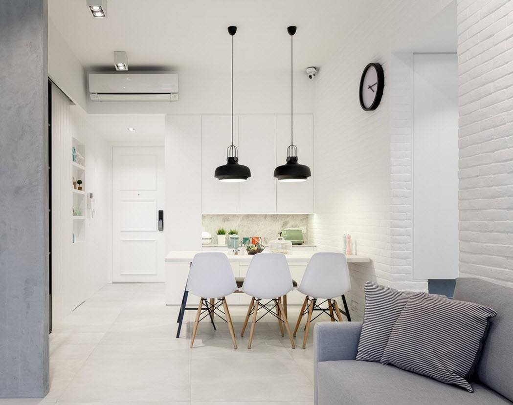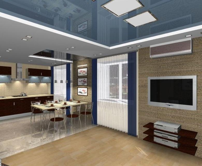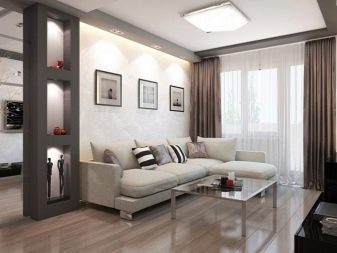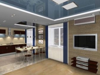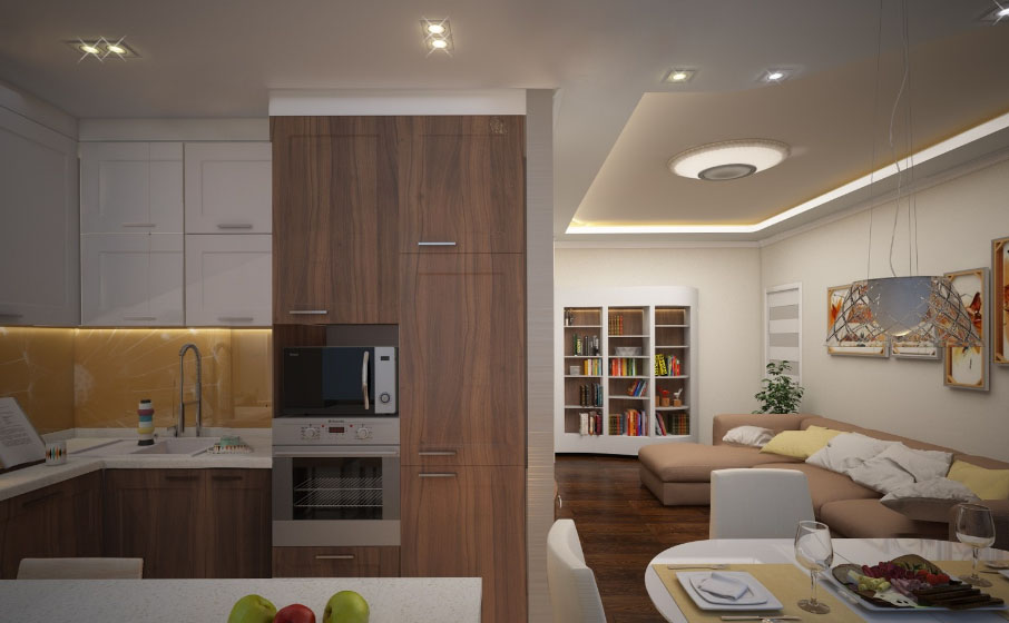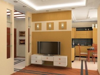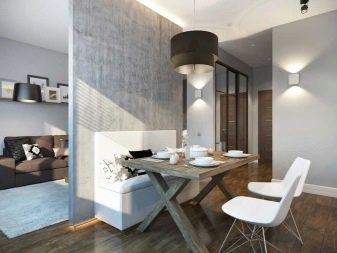 Eine andere nicht gebrochene Art, den Raum zu teilen, ist die Beleuchtung.Die Hintergrundbeleuchtung sollte unterschiedliche Schattierungen und Intensität haben. Markieren Sie zum Beispiel den Küchenbereich heller als den Rest.