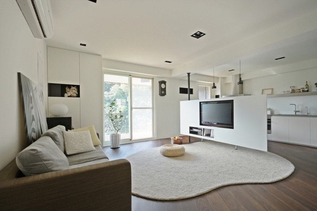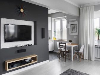 Für den Fernseher muss das Gehäuse nicht unbedingt installiert werden. Der Plasmabildschirm kann direkt an der Wand montiert werden. Und gegenüber, in einem freien Platz, um bequeme Stühle und einen Kaffeetisch zu setzen.