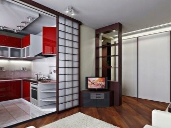 Trennen Sie den Küchenbereich, indem Sie ein hohes Regal platzieren. Praktisch und praktisch. Oder eine kleine Gipskartonwand. Oft wählen Partitionen durchscheinend.Oder komplett transparent aus Sicherheitsglas.