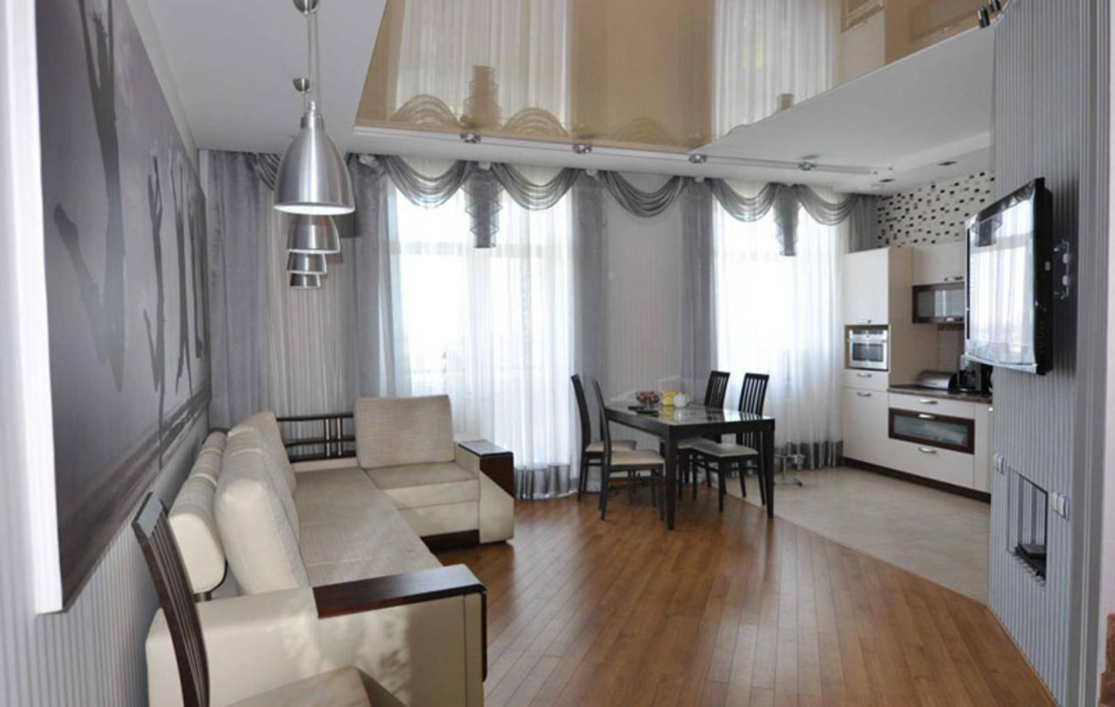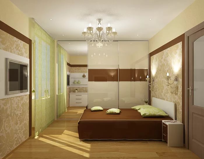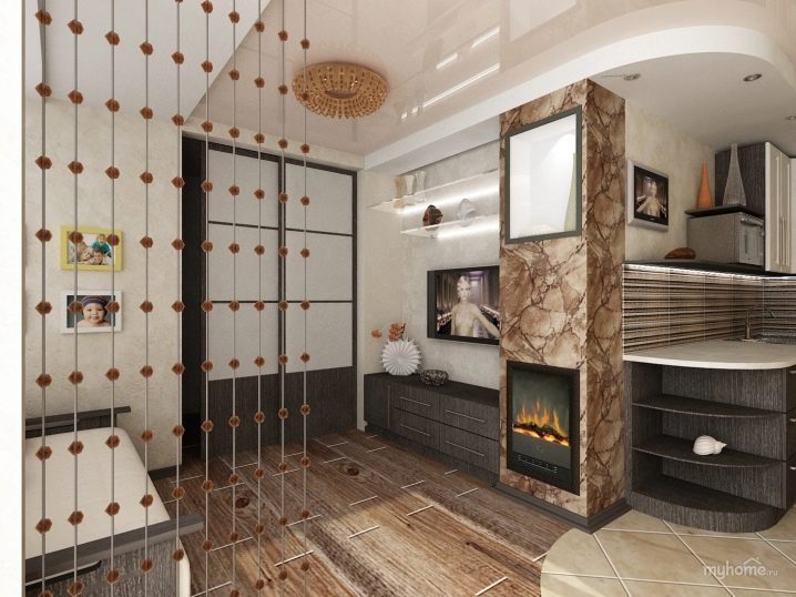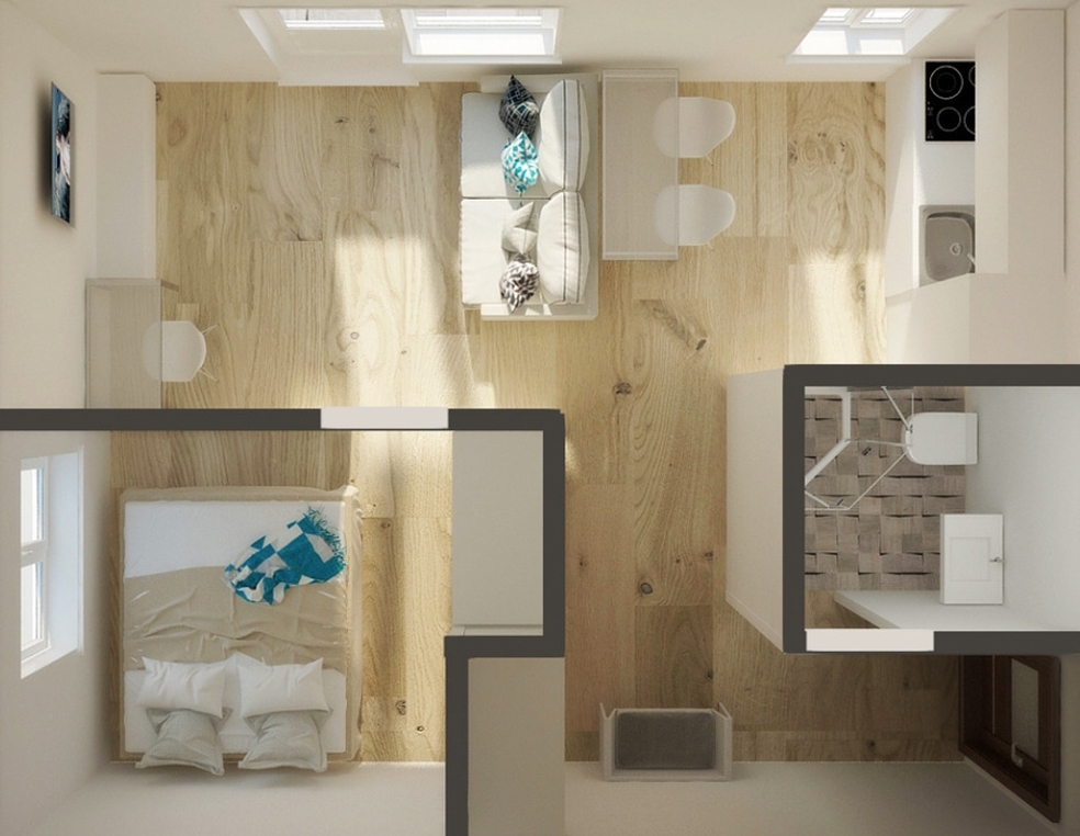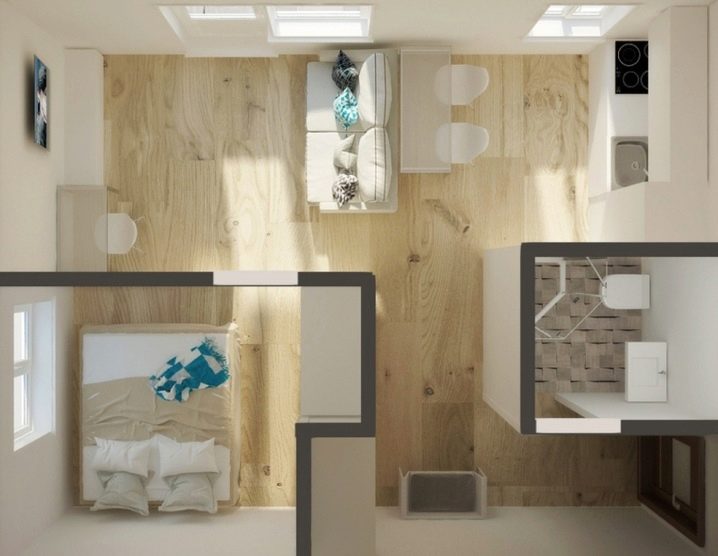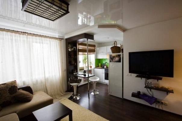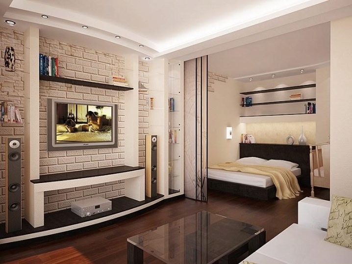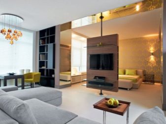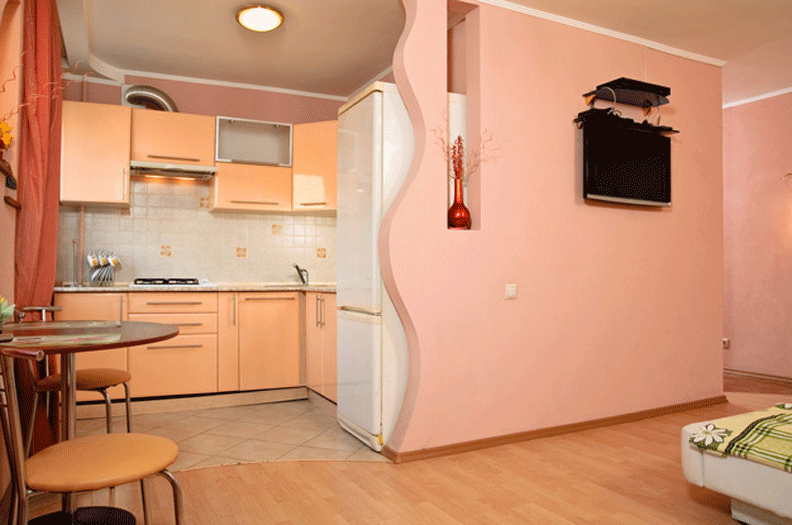 Auf dem Territorium der kombinierten Küche können Sie mit Freunden plaudern, fernsehen. Im Schlafzimmer bleibt der persönliche Raum erhalten.