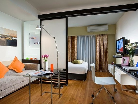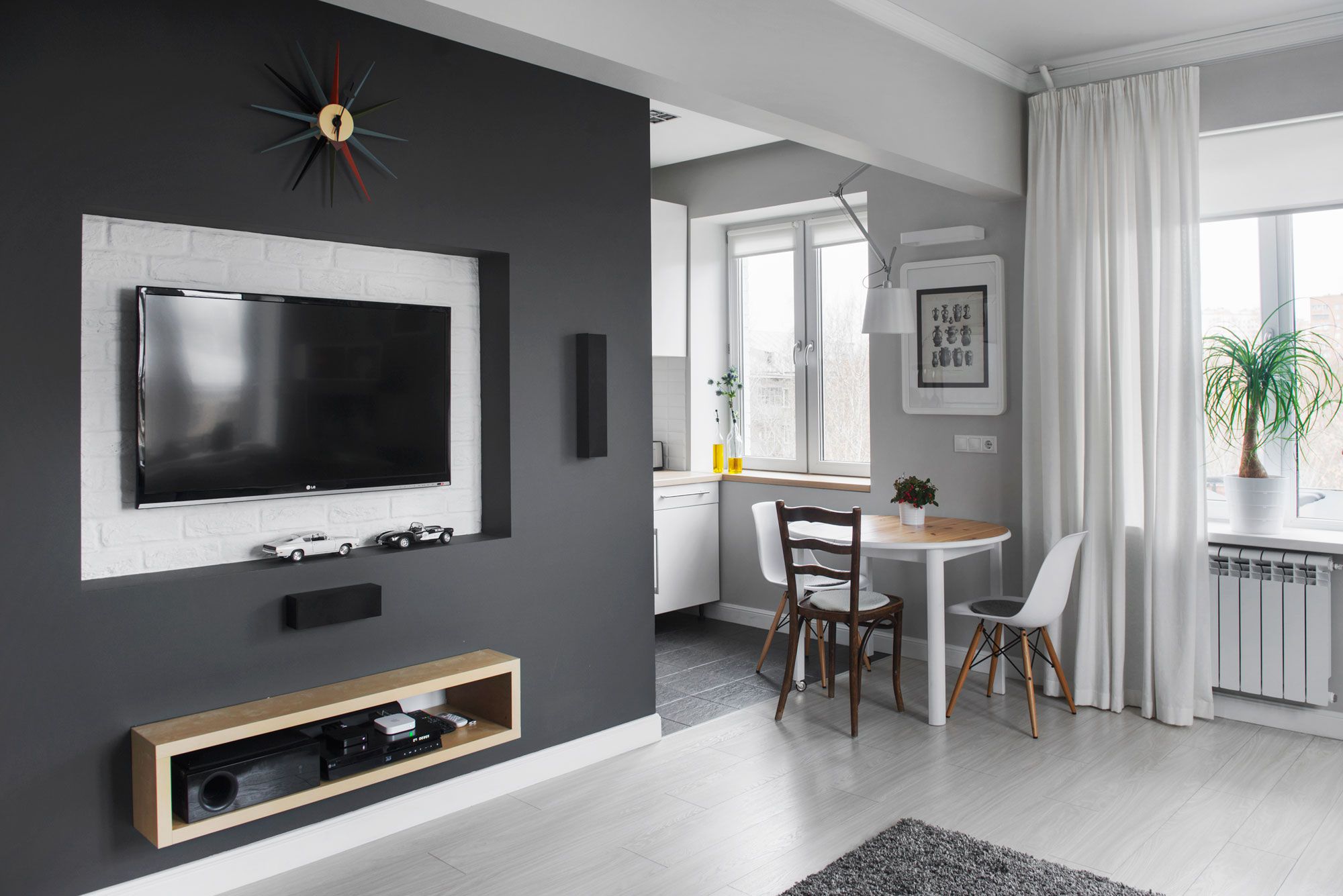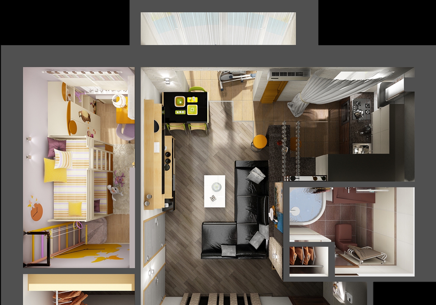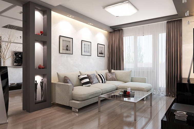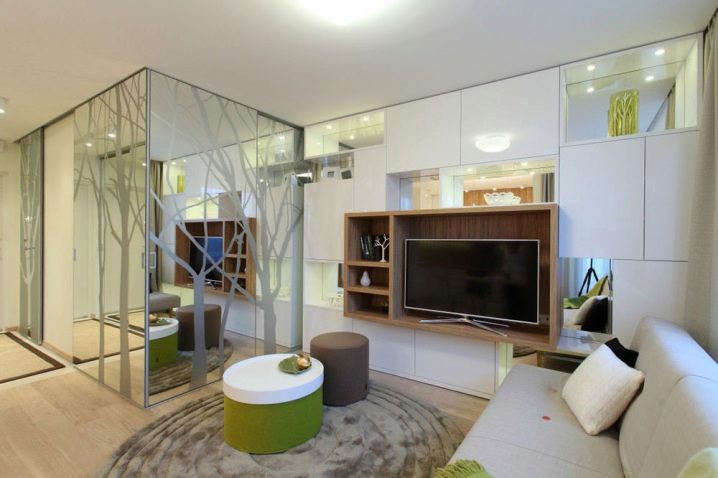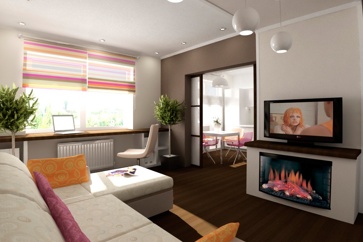 Auf dem Territorium der kombinierten Küche können Sie mit Freunden plaudern, fernsehen. Im Schlafzimmer bleibt der persönliche Raum erhalten.