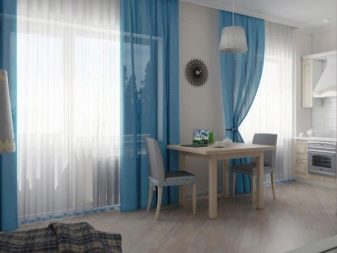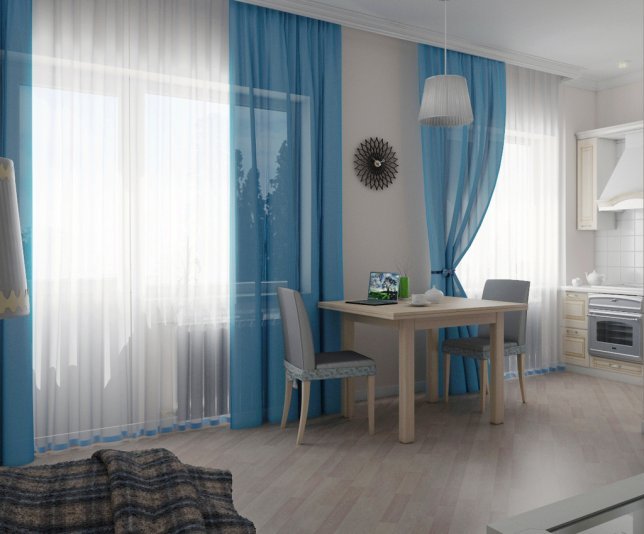 Vorhänge besser zu wählen, synthetische, die schnell trocknet und kein Bügeln erfordern.Im Küchenbereich des Ateliers lohnt es sich, kurze Schleier, Bambusvorhänge oder Rollos zu bevorzugen. Eine gute Wahl - Farbrollos passend zum gesamten Innenraum.