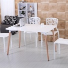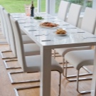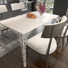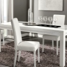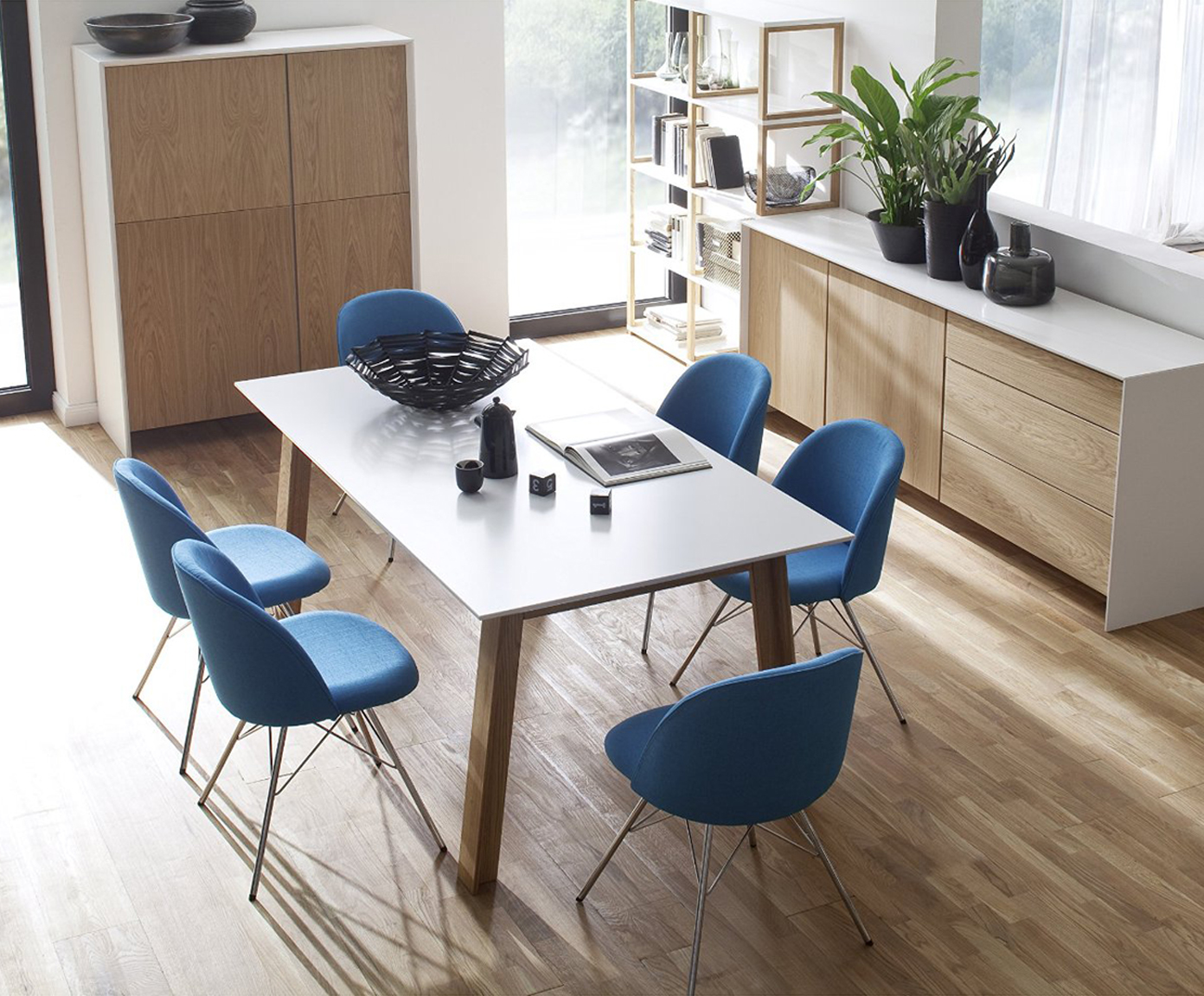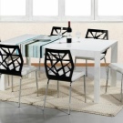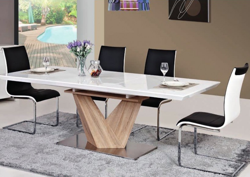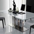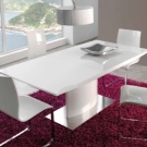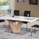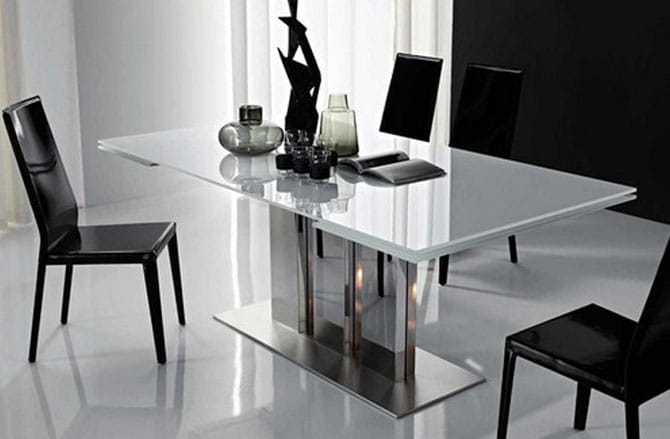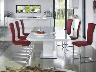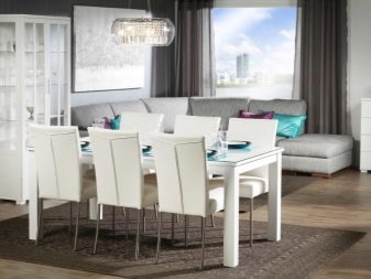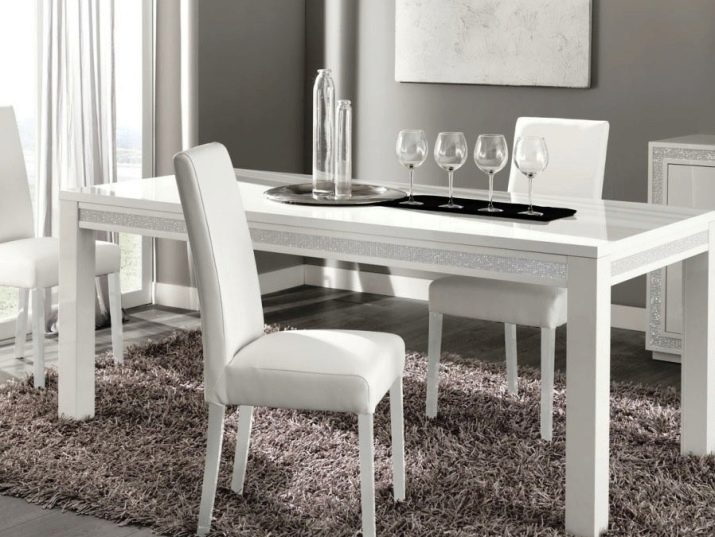 Der glänzend weiße rechteckige Tisch schafft den Eindruck eines weiten Raumes und vergrößert selbst den geräumigen Speisesaal optisch. Die weiße Tischplatte wirkt prägnant in Kombination mit hellem Holz von kalter Farbe und schwarzer Komplementärfarbe der Innenausstattung.