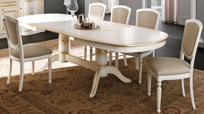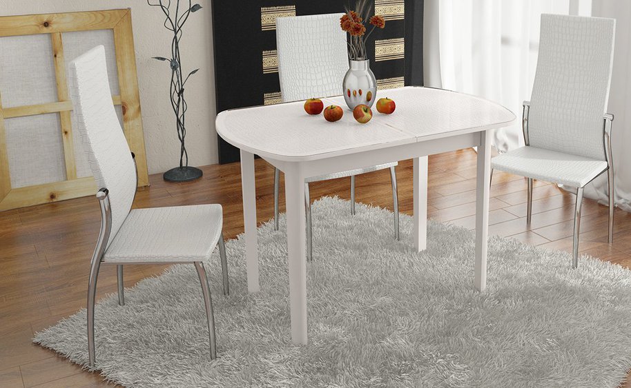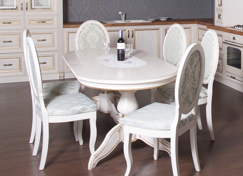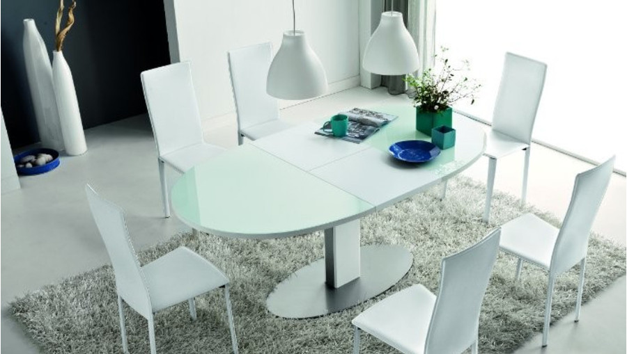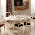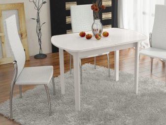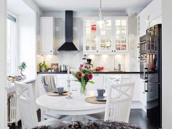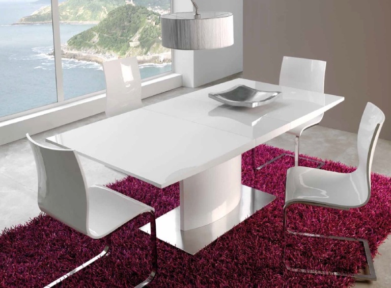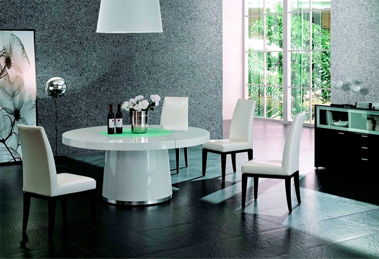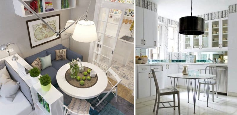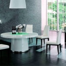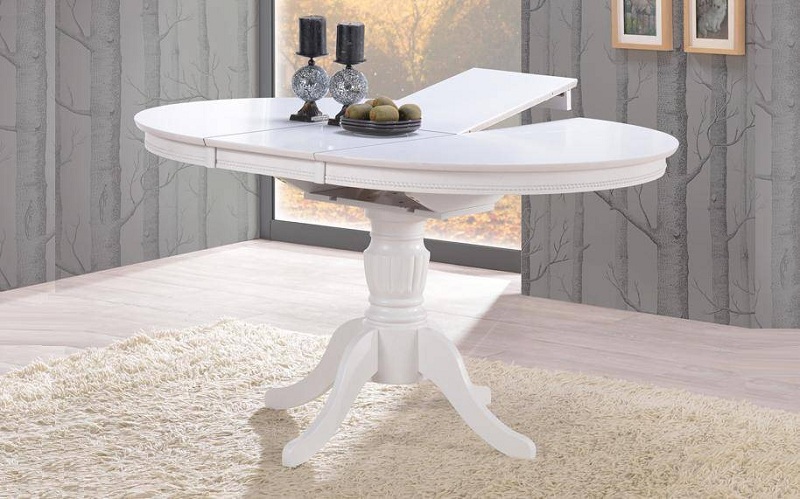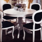 - Rund und oval - Diese Formen sind gut für eine geräumige Küche, weil sie mehr Platz darauf einnehmen.Wenn Sie einen weißen runden Tisch in einem kleinen Raum einrichten möchten, wählen Sie die kleine Größe der weißen Arbeitsplatten aus Holz oder MDF und die Faltbarkeit der Möbel, so dass Sie bei Bedarf die Möglichkeit haben, den Essbereich zu vergrößern.