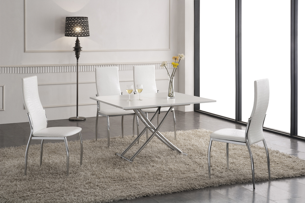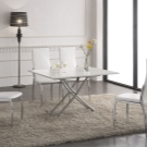 - Tabellen transformieren - neue und aktuelle Modelle, die in ihrer ursprünglichen Form niedrigen Sockeln ähneln und in ungefalteter Form - ein vollwertiger Tisch mit 75 cm Höhe und 100 cm Länge - ermöglicht durch die Verwendung von Tellern und Mechanismen nicht nur die Breite, sondern auch die Höhe des Tisches ihr Heben und Senken.