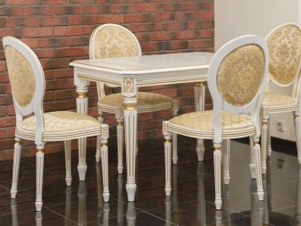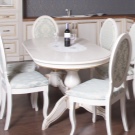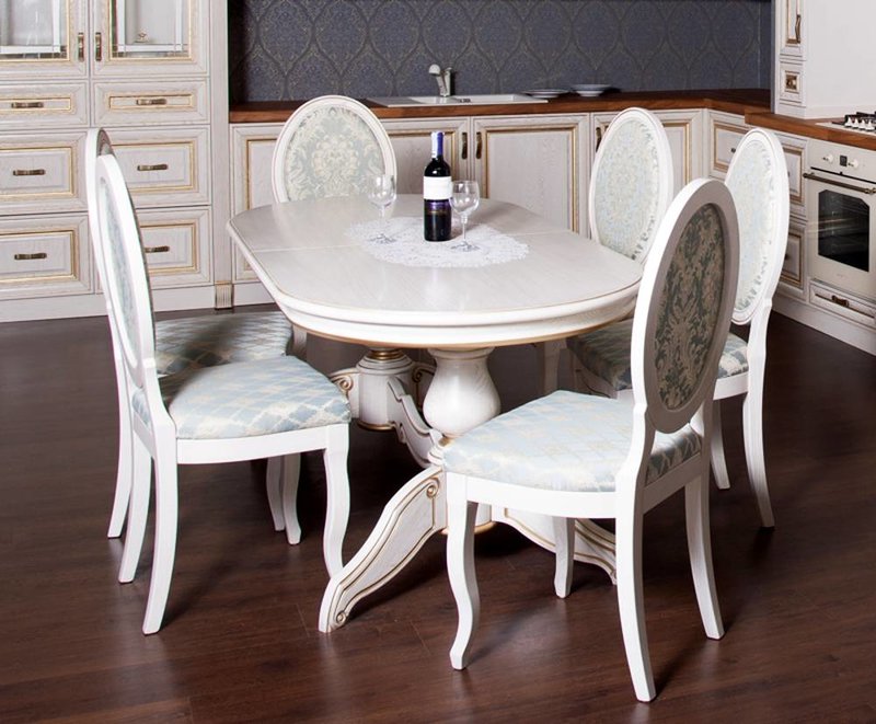 Der Küchentisch mit Patina eignet sich für die Vervollständigung des klassischen oder "englischen" Kücheninterieurs und wird eine schicke Ergänzung zum Raumbild sein. Patinierte Modelle sind mit einer Patina an den Fassaden der Kücheneinheit kombiniert, die es ermöglicht, eine ganze Reihe von Möbeln zu schaffen, übrigens werden oft ähnliche Möbelstücke zusammen verkauft.
