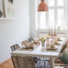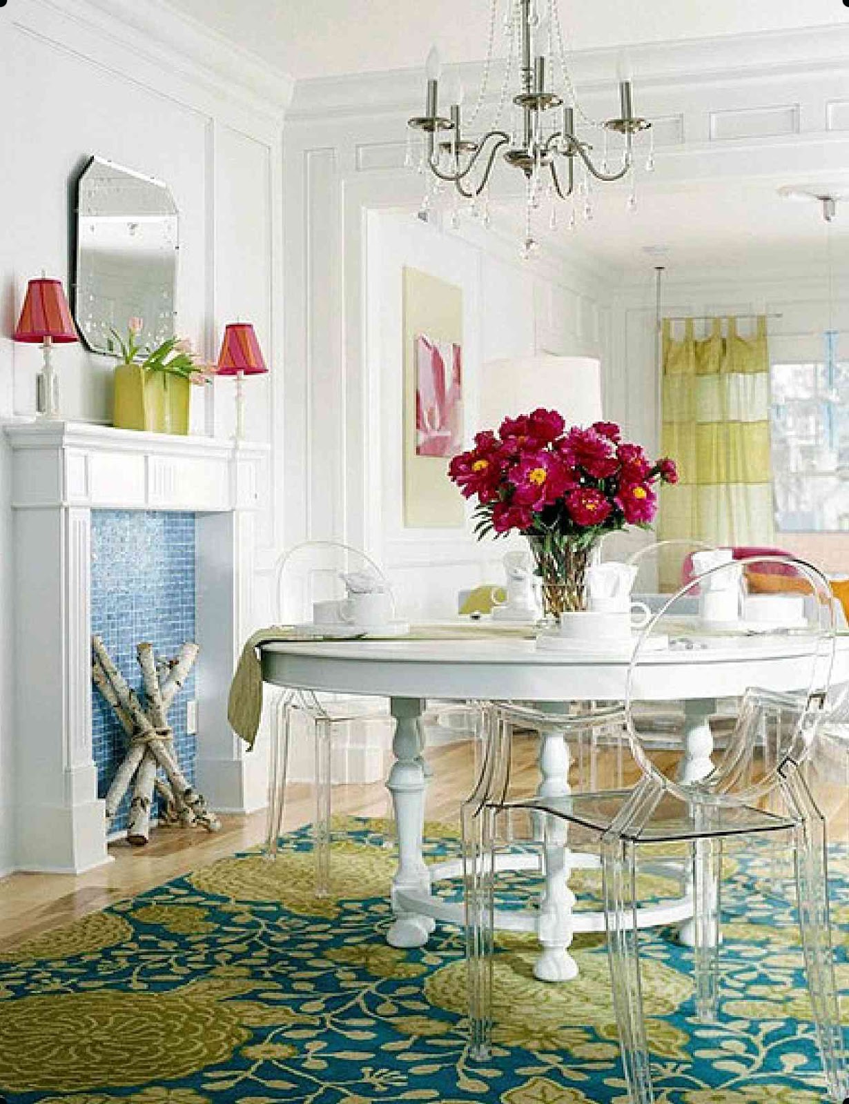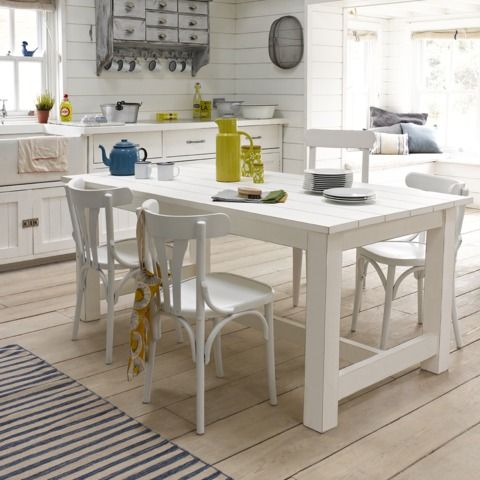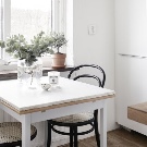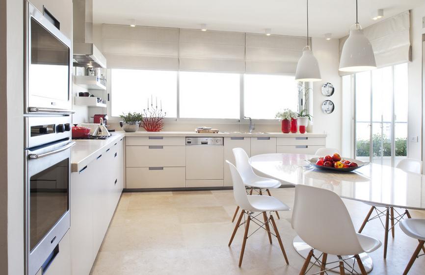 - Wie bereits erwähnt Der Tisch sollte nicht die Farbe der Küchenfassade wiederholen; Schaffen Sie einen separaten Sitz- und Essbereich in leuchtenden Farben, wobei der weiße Tisch im Vordergrund steht.