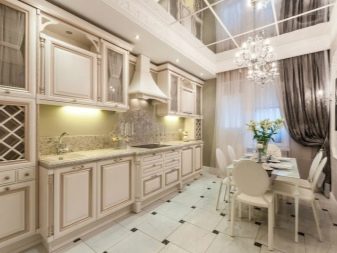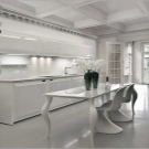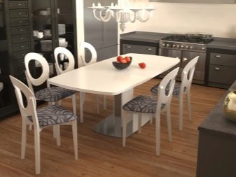 Von Zeit zu Zeit entwerfen Designer Interieurs für eine Küche mit einem schneeweißen oder hellen massiven Tisch, der als Hauptakzent dient. Eine interessante Lösung wäre, ein Holzmodell eines schneeweißen Schattens unter einem dunklen Boden zu wählen; während der Rest der Wohnung Möbel hat einen hellen Schatten - in der Regel weiß.