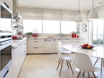 - Weiße Farbe ist universell; es ist wie eine Leinwand, um ein Meisterwerk der Innenausstattung zu schaffen. Eine weiße Tischplatte passt in jedes Format der Küche - von klassisch (dies umfasst auch den "englischen" Stil, "Provence", "Country") bis zum ultramodernen (High-Tech, Minimalismus) ist es wichtig, das Material der Möbel und Formen zu wählen.
