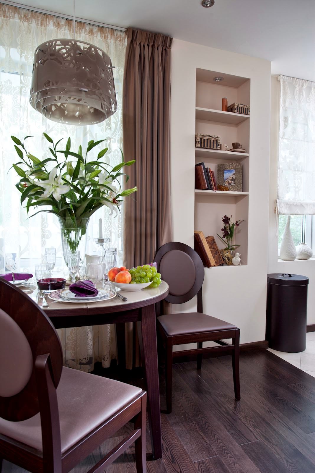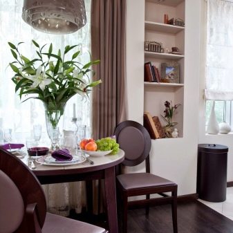 - Die weiße Farbe der Esszimmermöbel harmoniert gut mit den dunklen Fassaden der Küche.; Es ist nicht notwendig, die Arbeitsplatte an den Schatten der Küche zu binden, die Möbel sollten in Form und Stilrichtung ähnlich sein.
