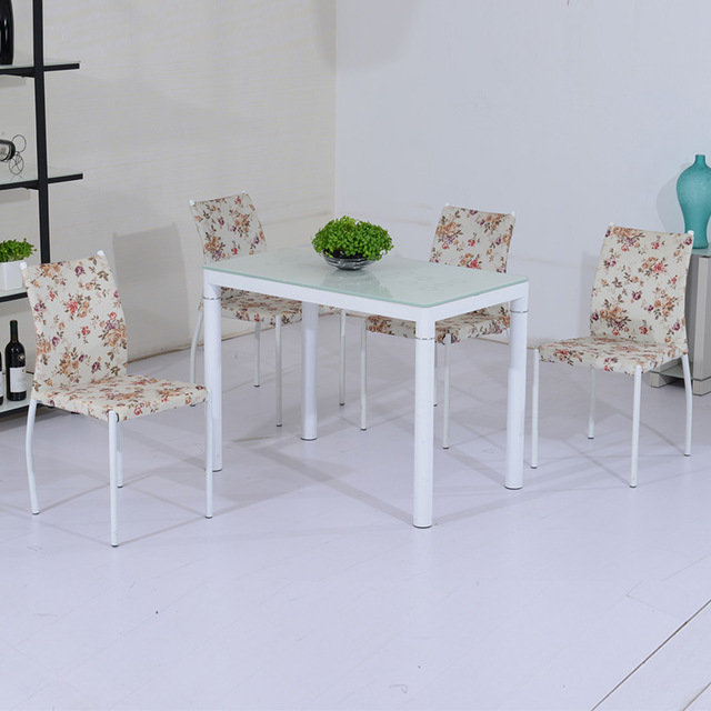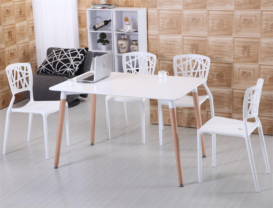 Eine praktische Lösung ist die Wahl eines weißen rechteckigen Tisches für 4 Personen. Es wird für eine einfache und kleine Küche, kombiniert mit verschiedenen ungleichförmigen Stühlen, wie auf dem Foto unten angemessen sein.